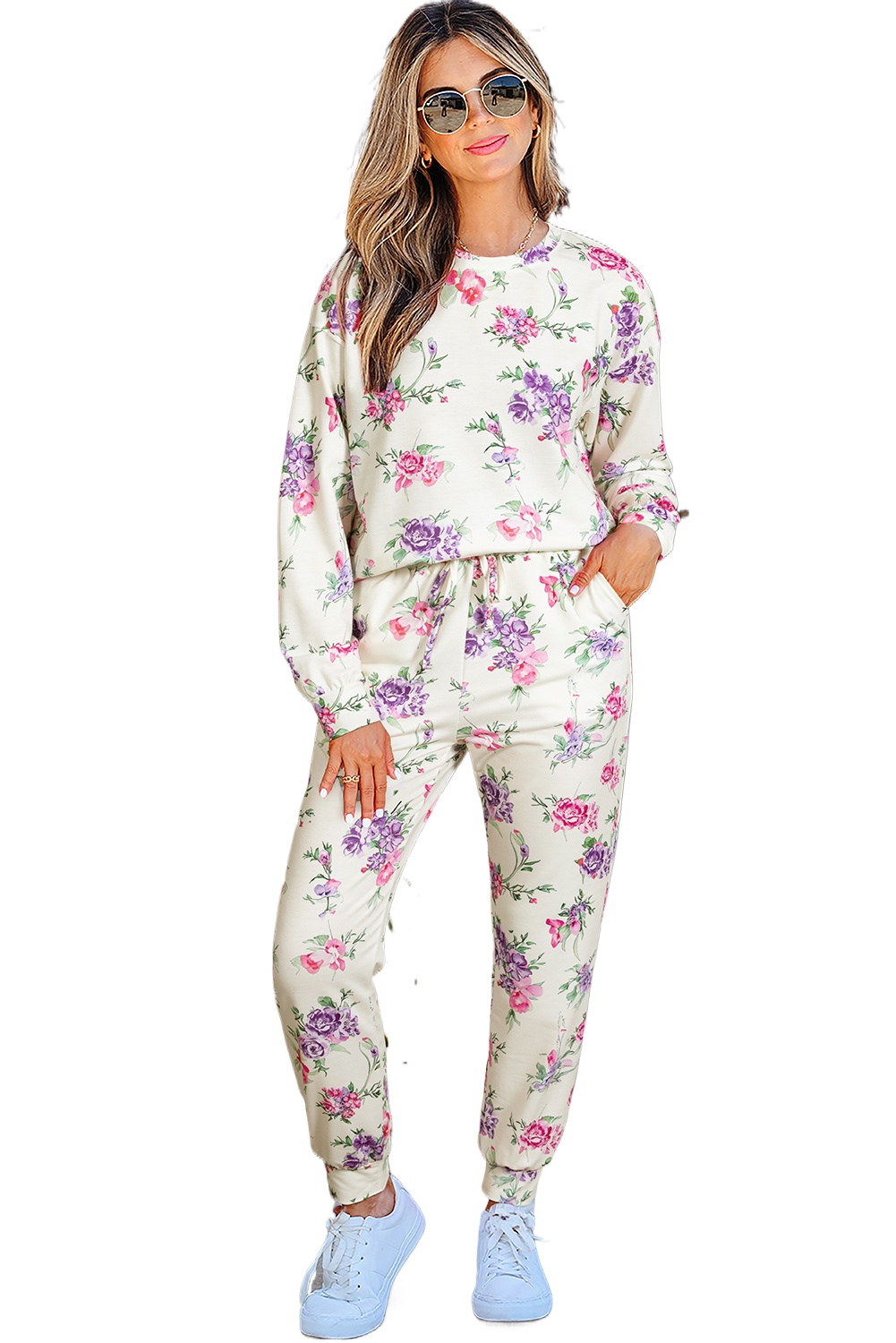 1. **Charming Floral Print**: The Apricot Floral Print Pullover Drawstring Lounge Pants Set features a delightful floral pattern that adds a touch of elegance and charm to your loungewear collection, perfect for daily wear.