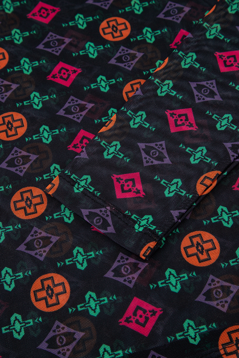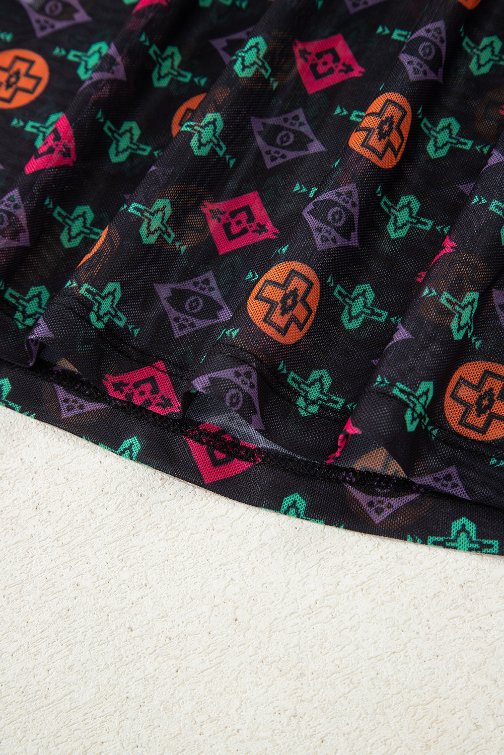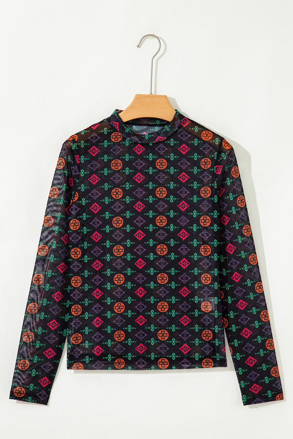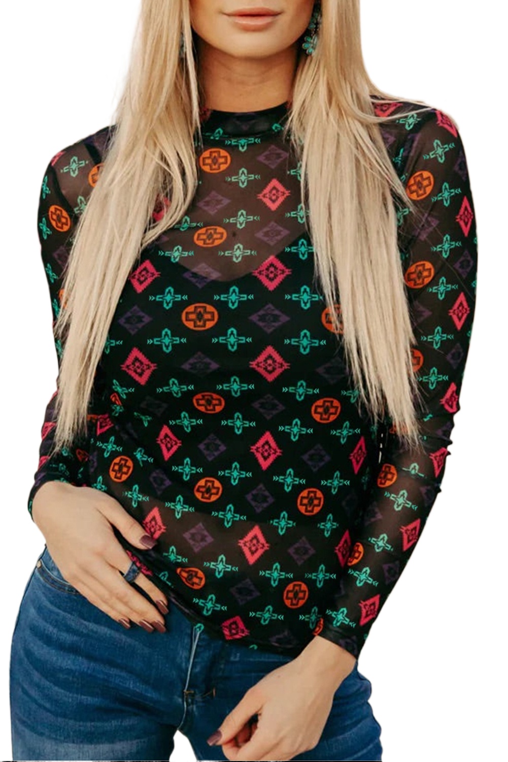 Black Western Aztec Printed Long Sleeve Sheer Mesh Top for Women