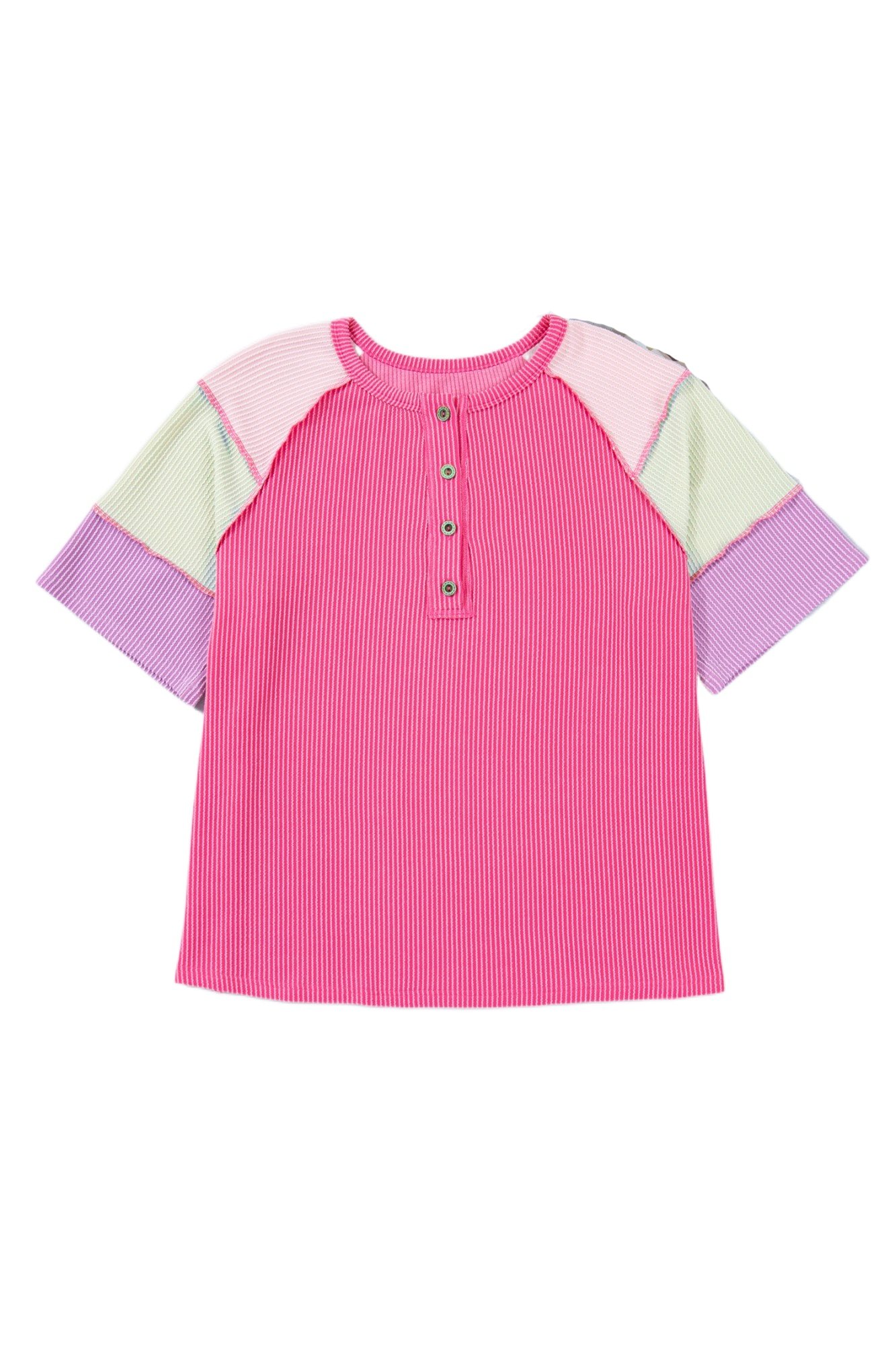 Bright Pink Plus Size Twisted Rib Color Block Henley Top – Casual Summer Essential for Women