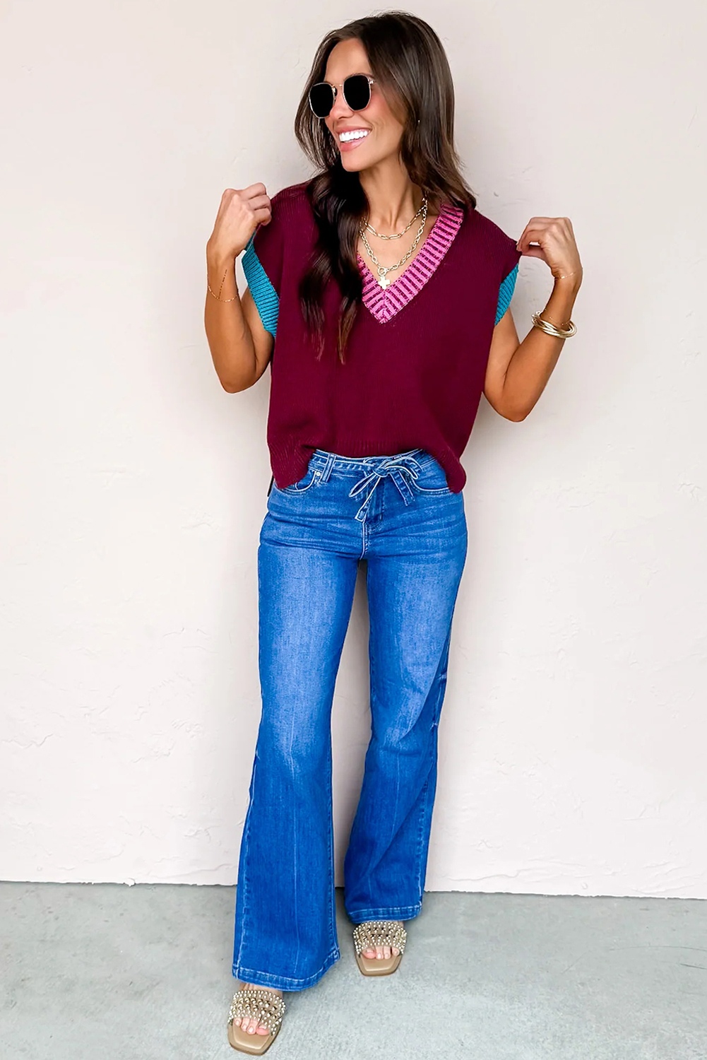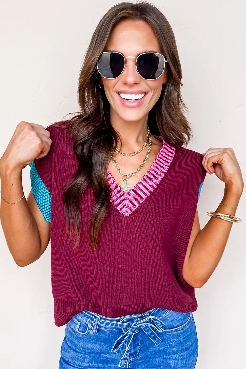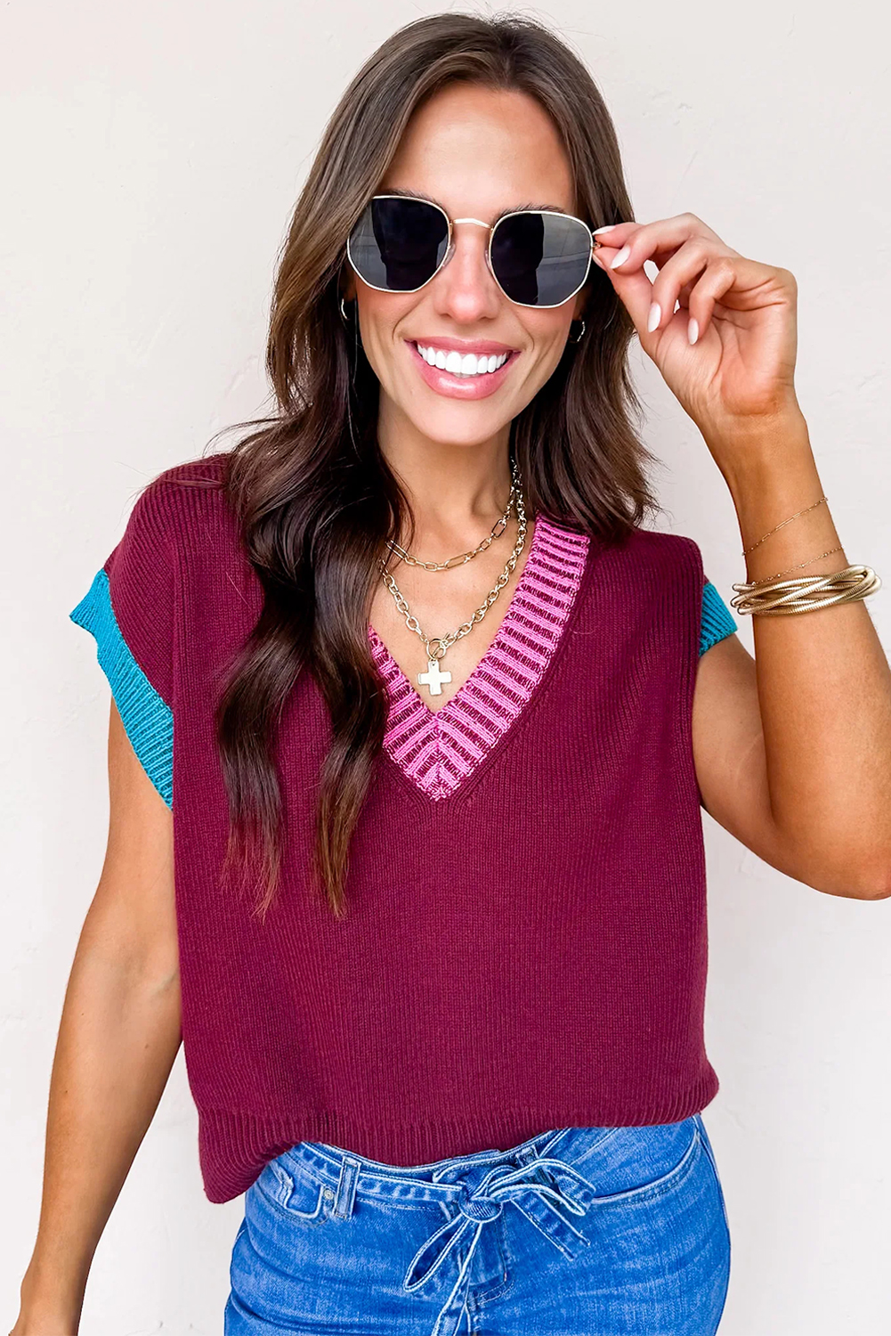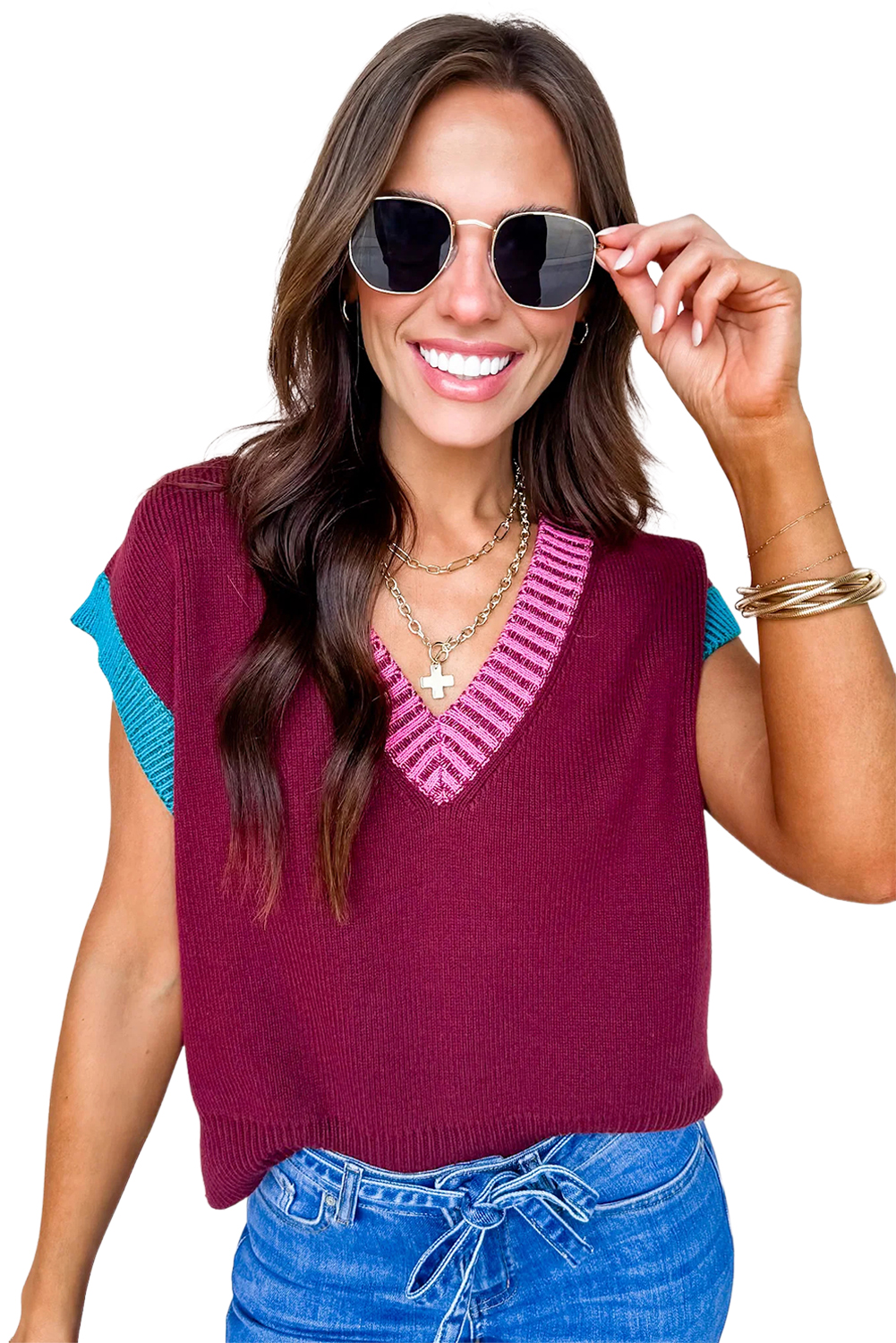 & Free Shipping1. Trendy Colorblock Design: The Burgundy Contrast Trim V Neck Cuffed Short Sleeve Loose Sweater features a stylish colorblock pattern that adds a modern touch to your casual wardrobe.