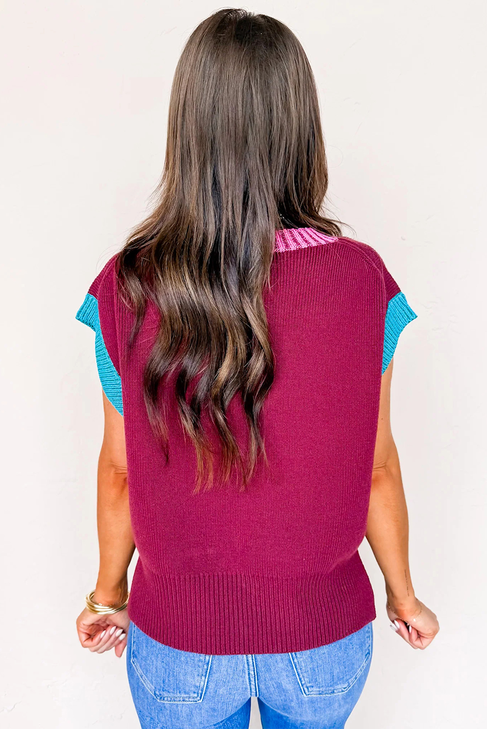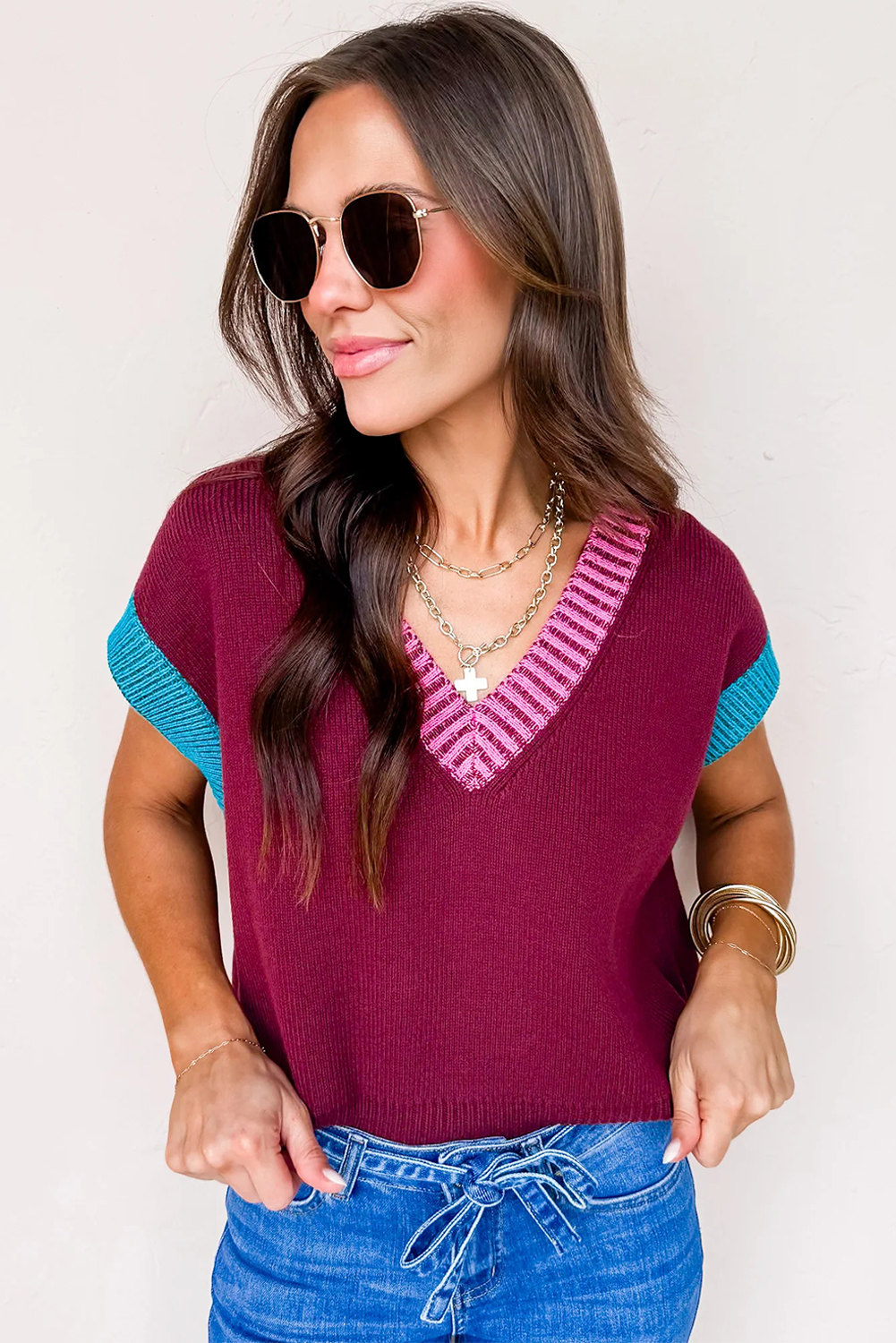 1. Trendy Colorblock Design: The Burgundy Contrast Trim V Neck Cuffed Short Sleeve Loose Sweater features a stylish colorblock pattern that adds a modern touch to your casual wardrobe.