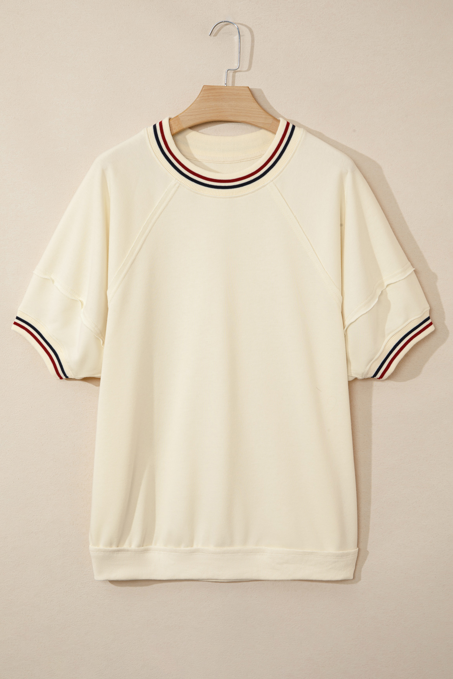 Casual Women’s Beige Contrast Tunic Top – Short Sleeve with Varsity Striped Neckline