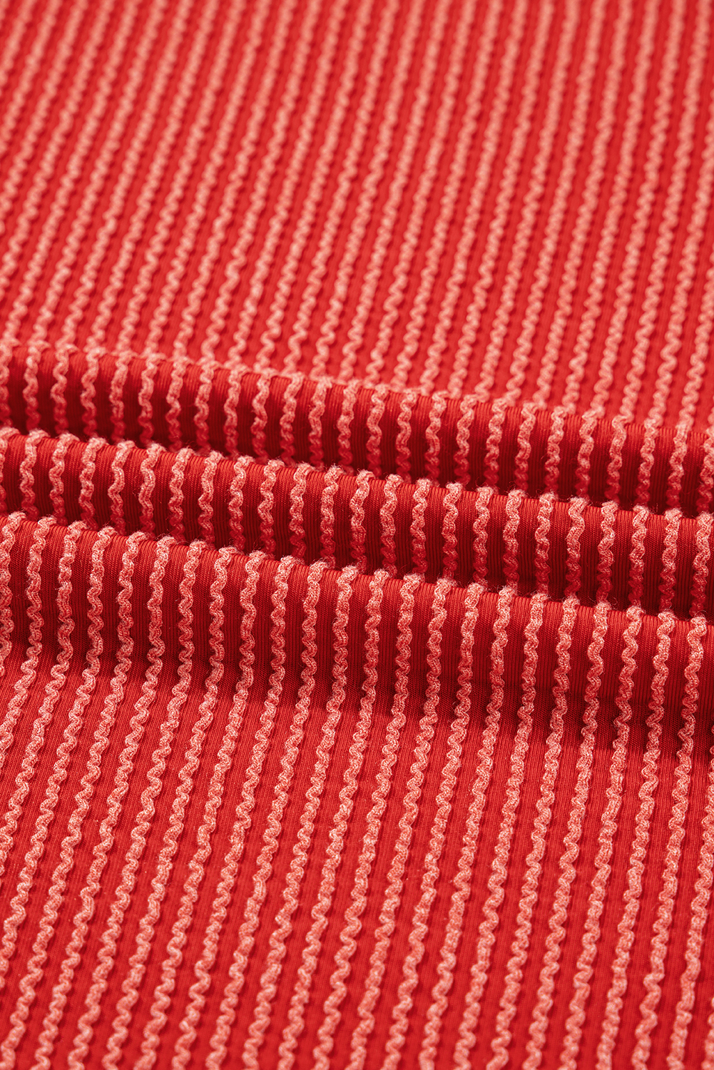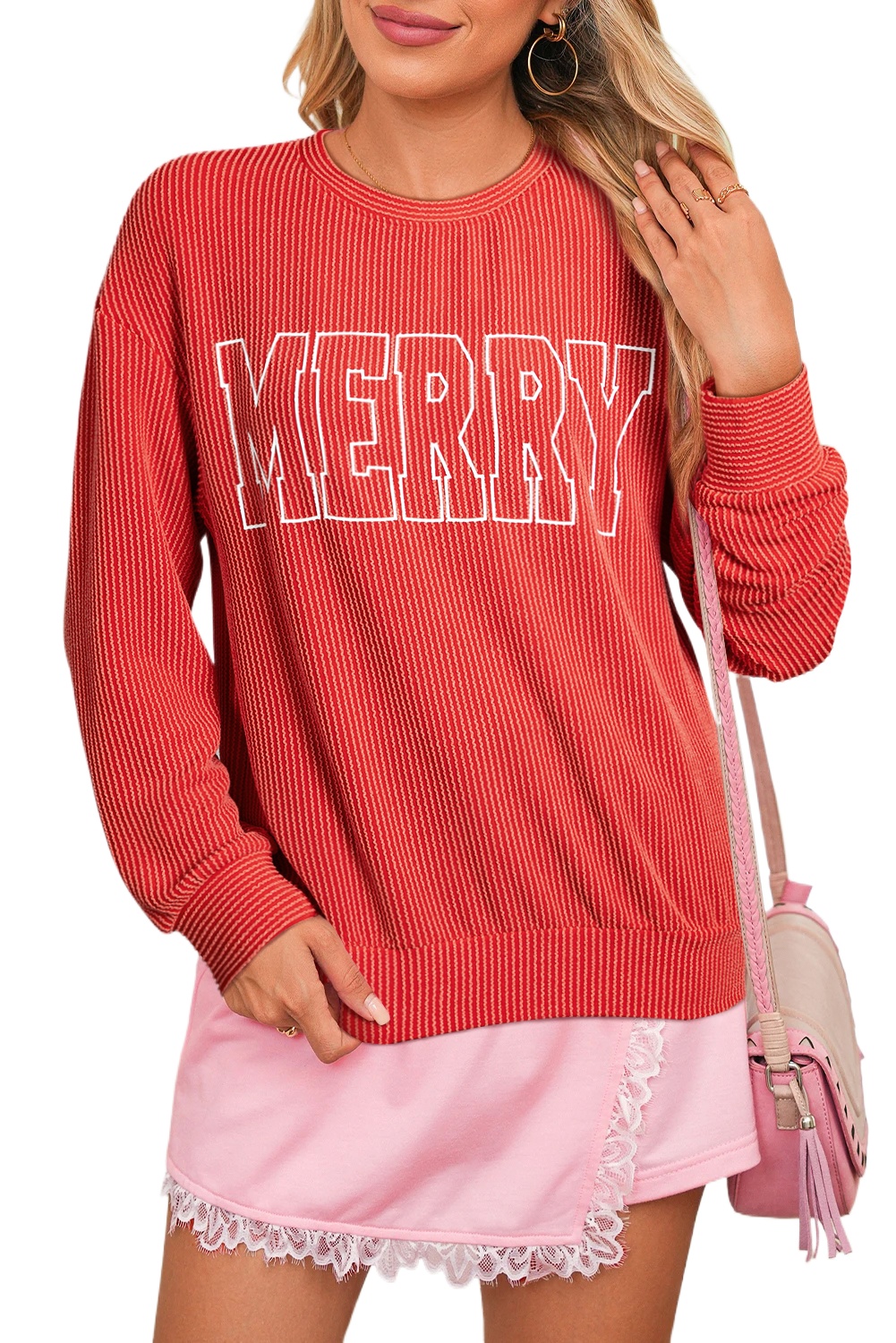 Casual Women’s Fiery Red Twisted Rib Long Sleeve Top – Merry Letter Graphic for Everyday Wear