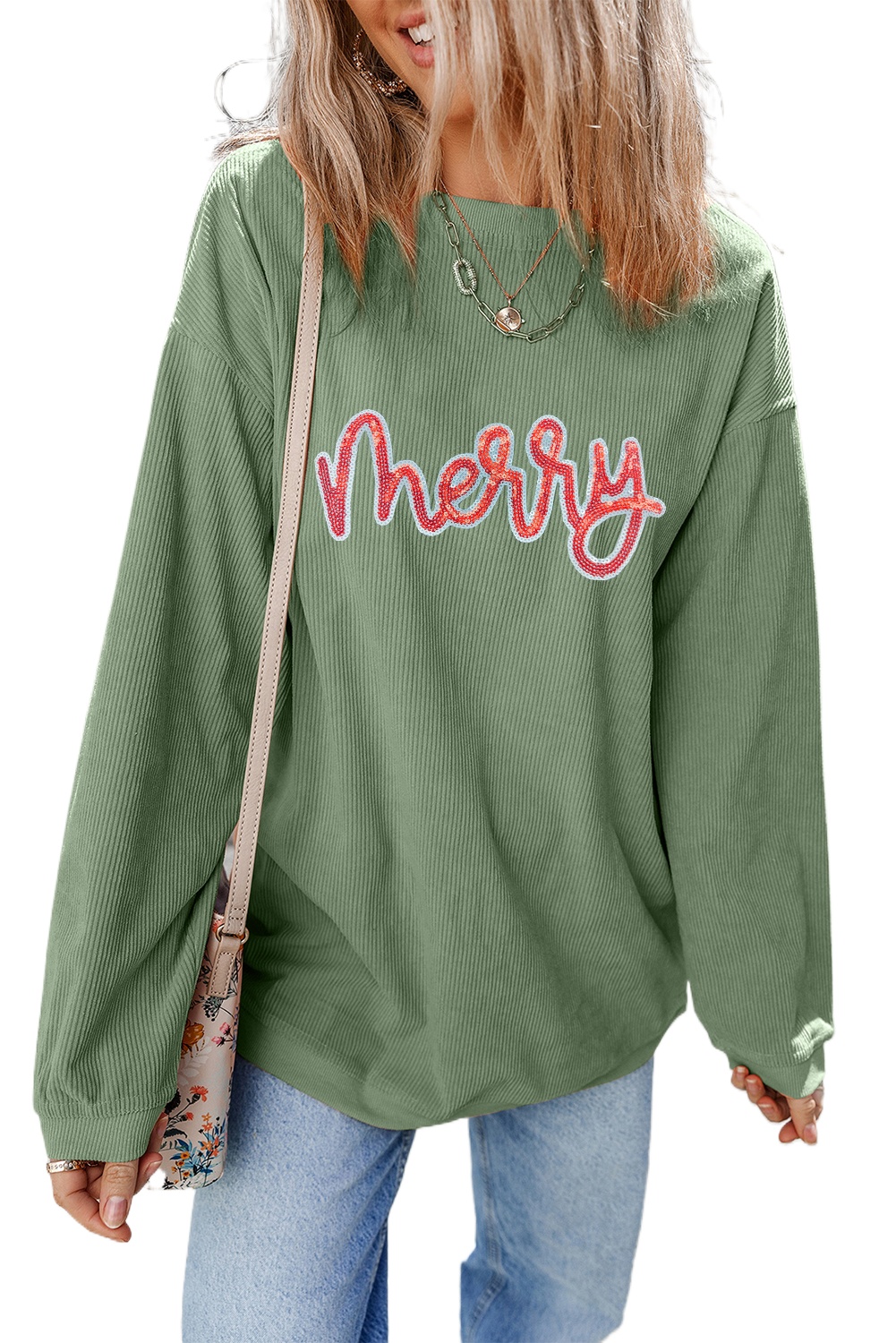 Casual Women’s Grass Green Sequined Merry Letter Graphic Sweatshirt for Daily Wear