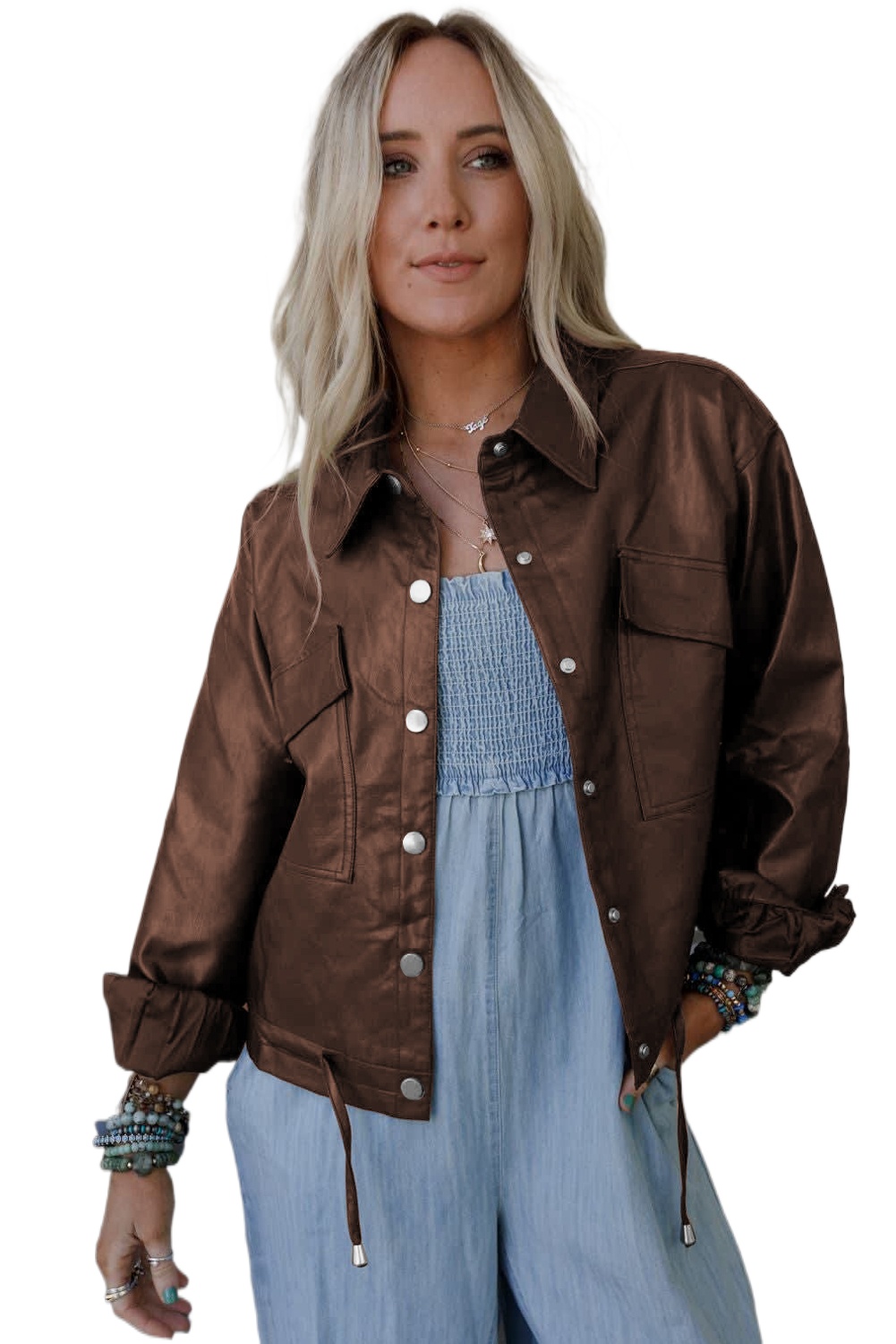 & Free Shipping1. **Fashionable Western Style**: The Chicory Coffee Double Flap Pocket Drawstring Hem Leather Jacket is designed with a trendy western flair, making it the perfect addition to your daily wardrobe or vacation ensemble.
