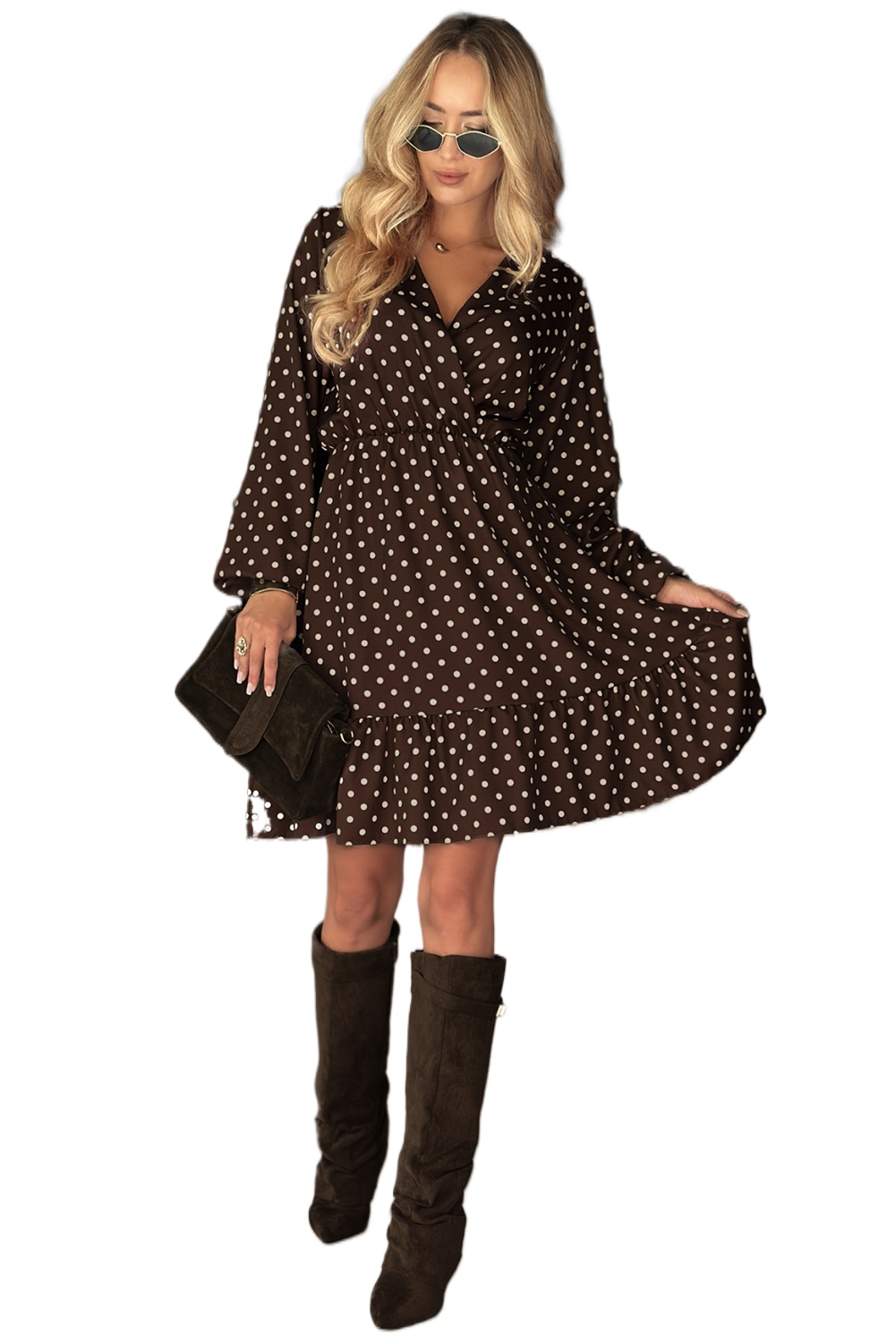 Chicory Coffee Polka Dot Mini Dress for Women – Long Sleeve V Neck Ruffle Hem for Daily Elegance