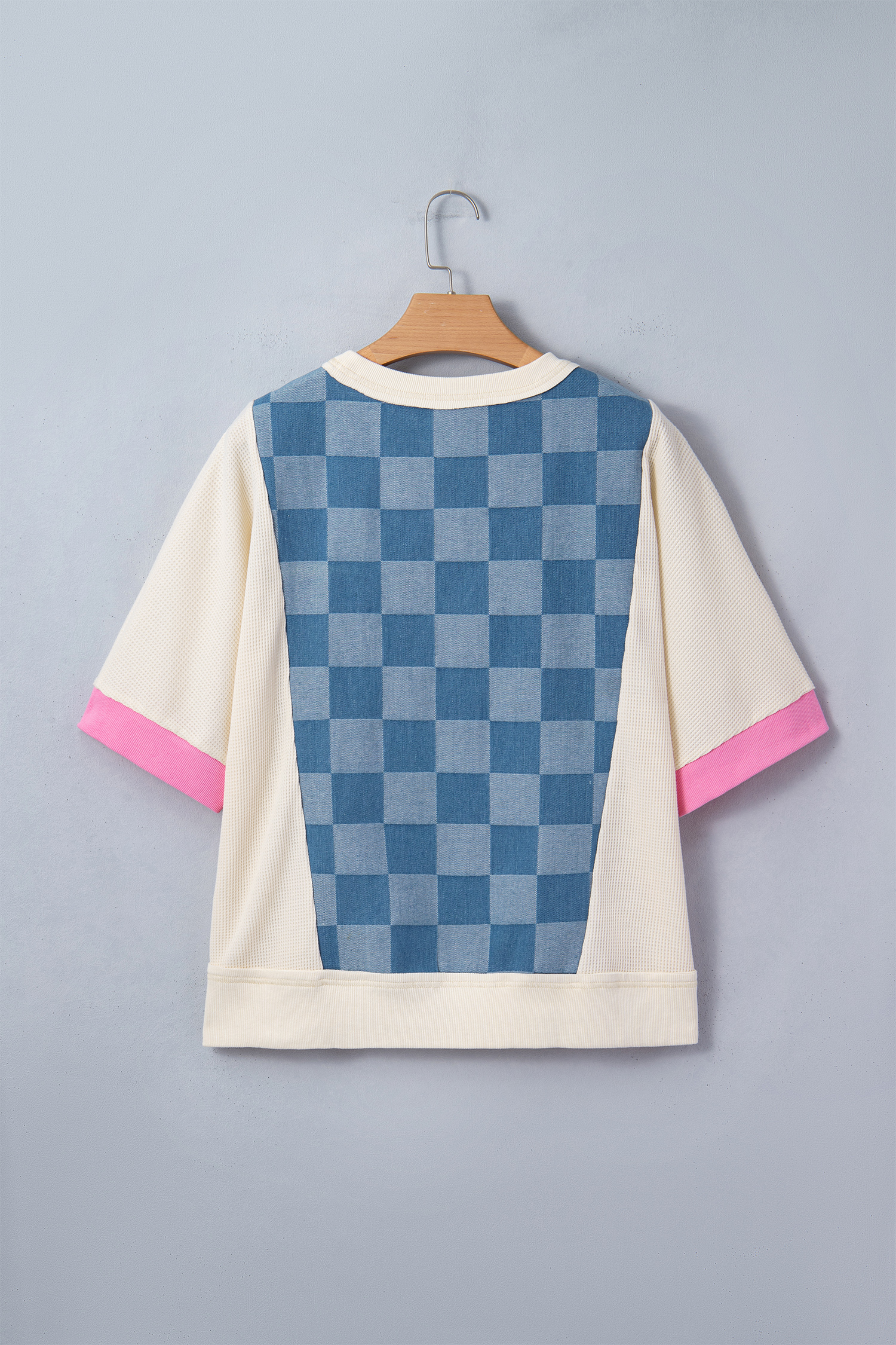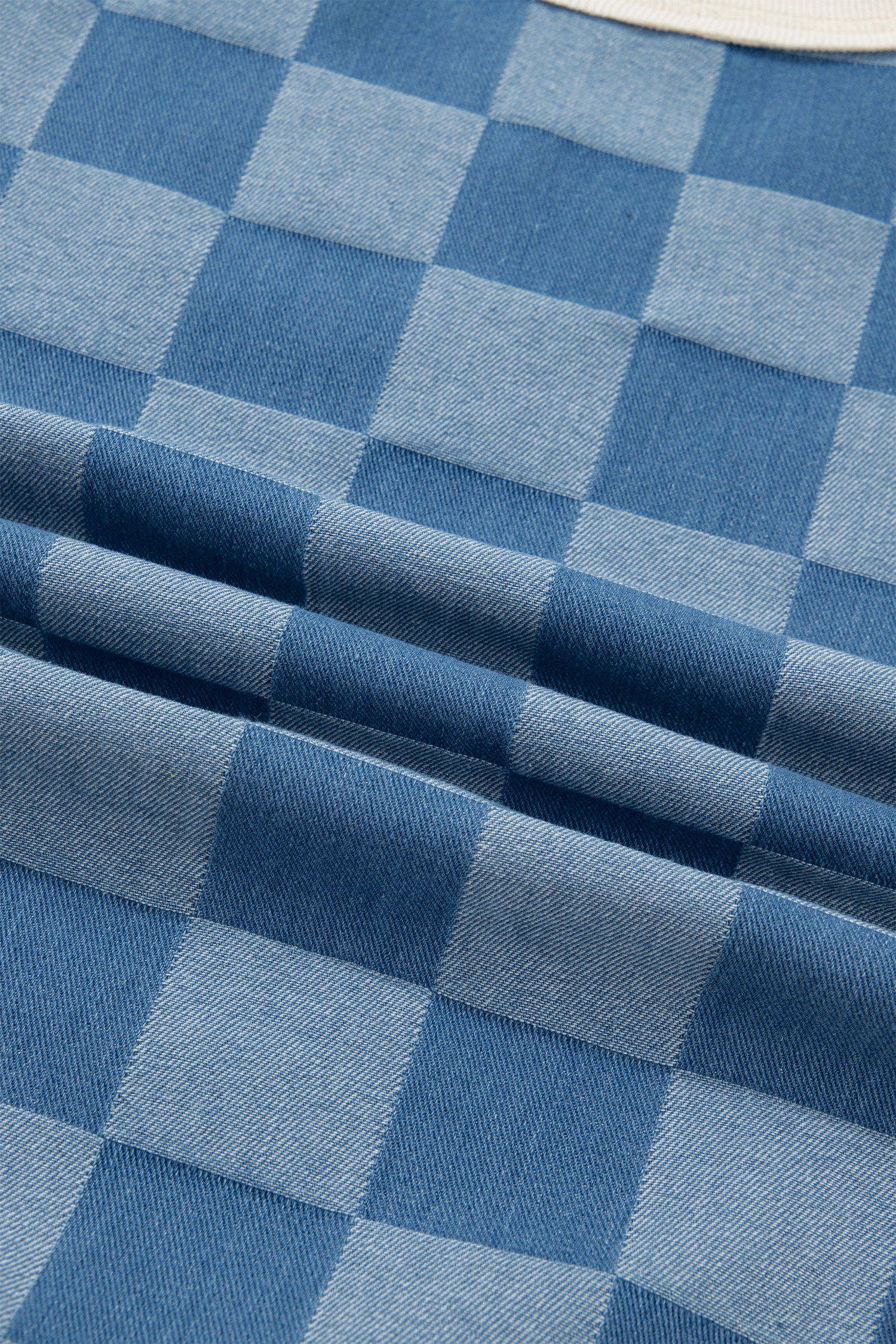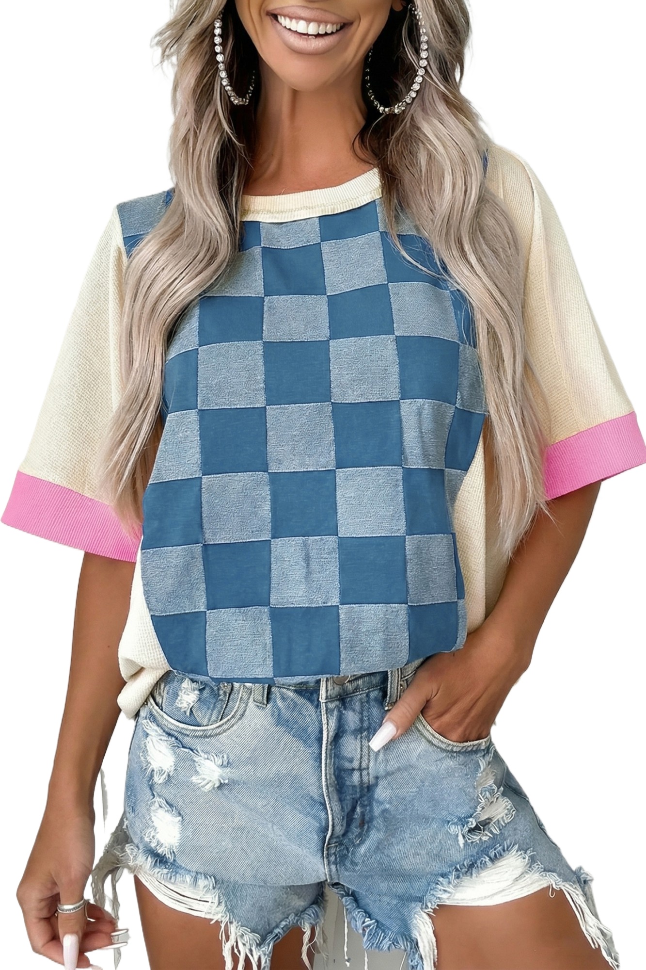 Dusk Blue Checkered Denim Patchwork Top for Women – Casual Short Sleeve Summer StyleDusk Blue Checkered Denim Patchwork Top for Women – Casual Short Sleeve Summer Style