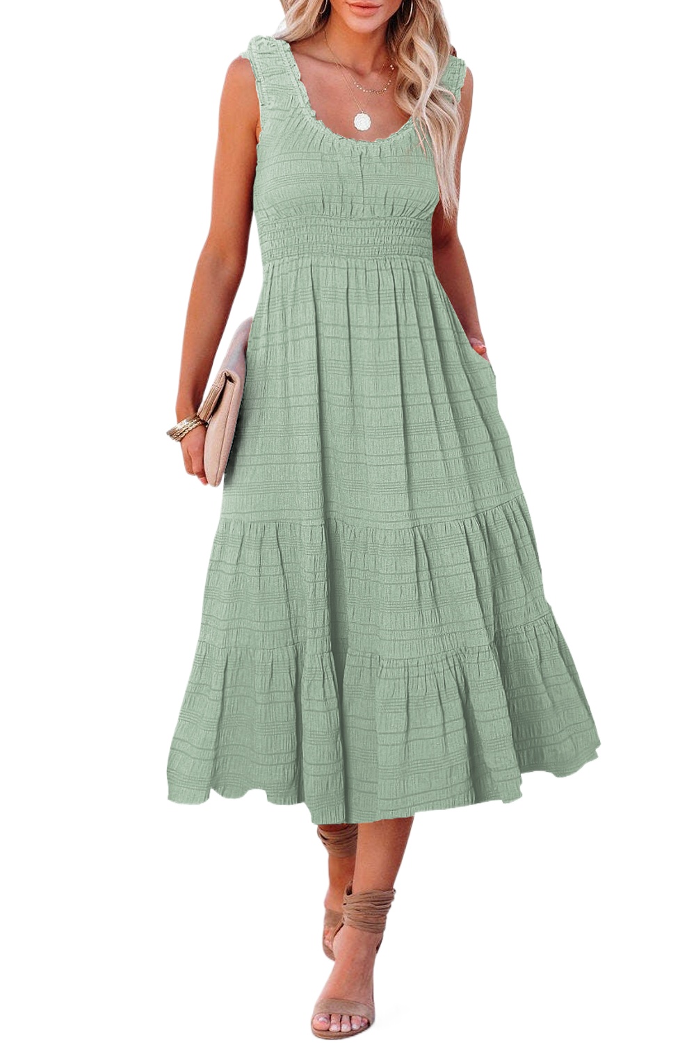 Elegant Women's Green Midi Dress – Sleeveless Sheath with Pleated Details for Summer OutingsElegant Women’s Green Midi Dress – Sleeveless Sheath with Pleated Details for Summer Outings