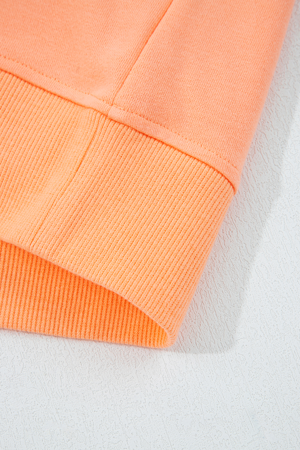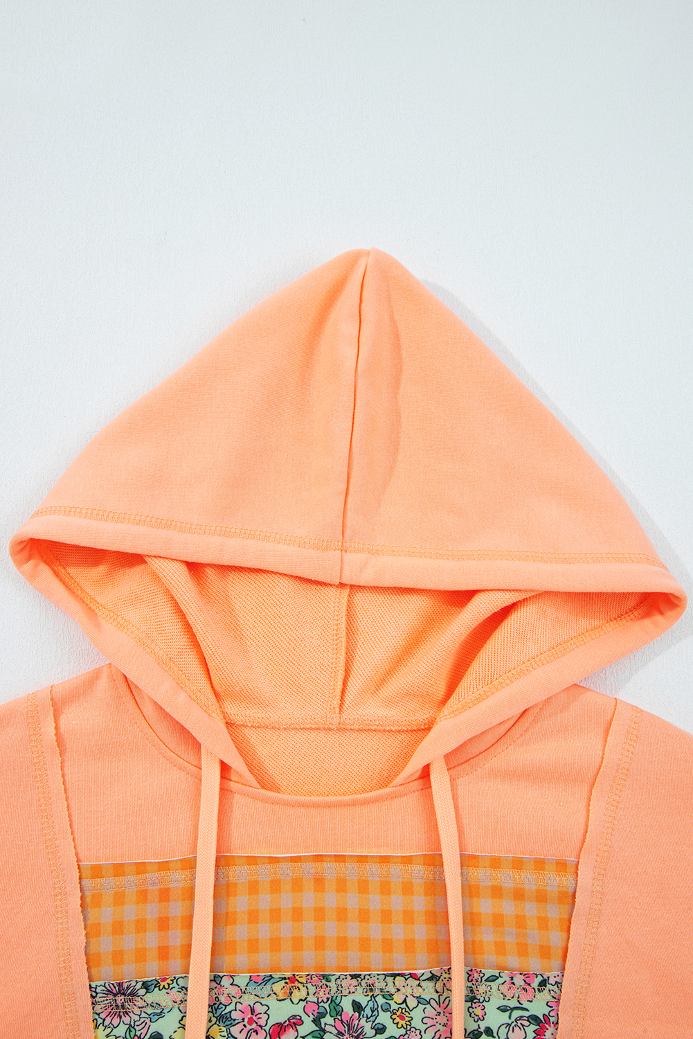 Grapefruit Orange Plaid Floral Patchwork Hooded Long Sleeve Top with Kangaroo Pocket
