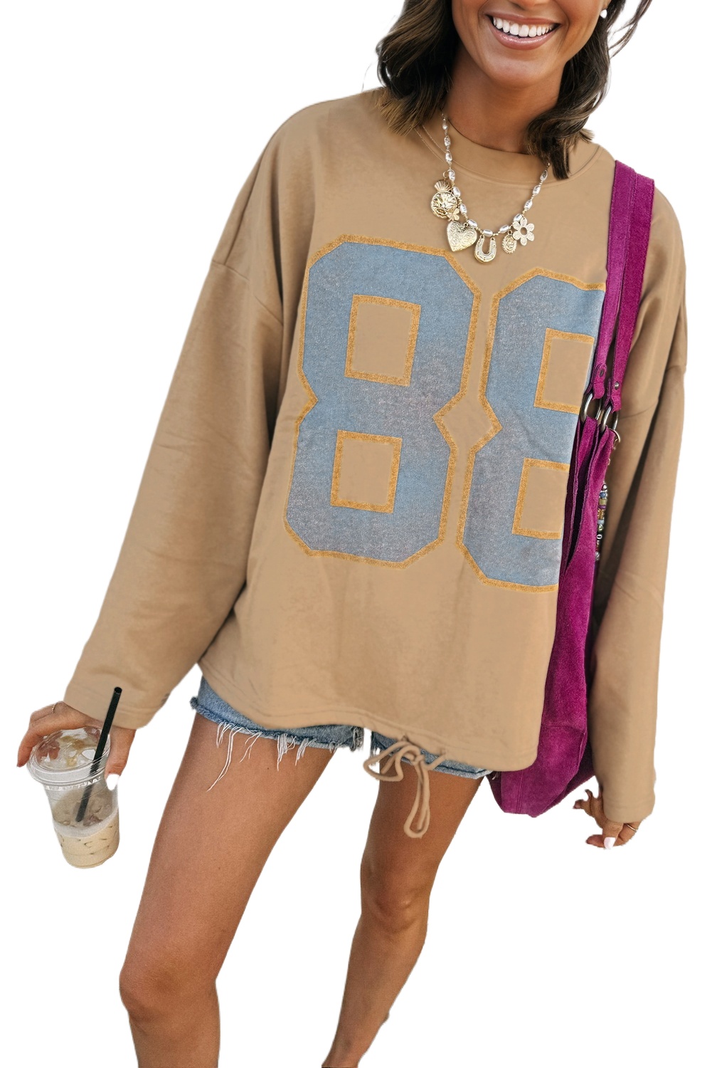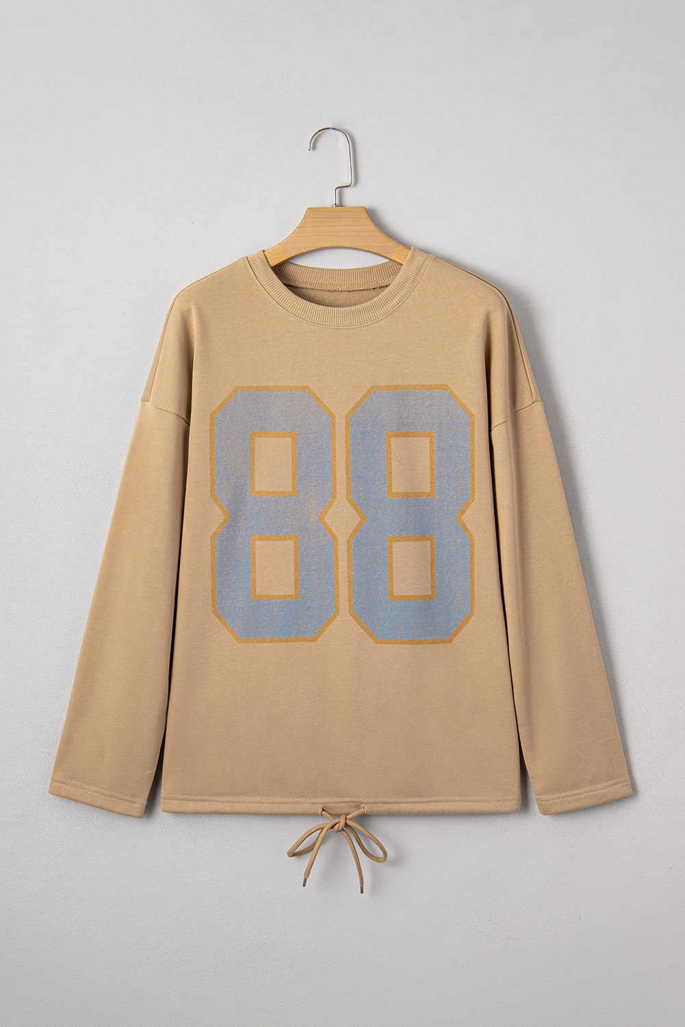 1. Trendy Graphic Design: The Khaki 88 Number Graphic Drawstring Hemline Oversize Long Sleeve Top features a stylish letter print that adds a playful touch to your casual wardrobe.