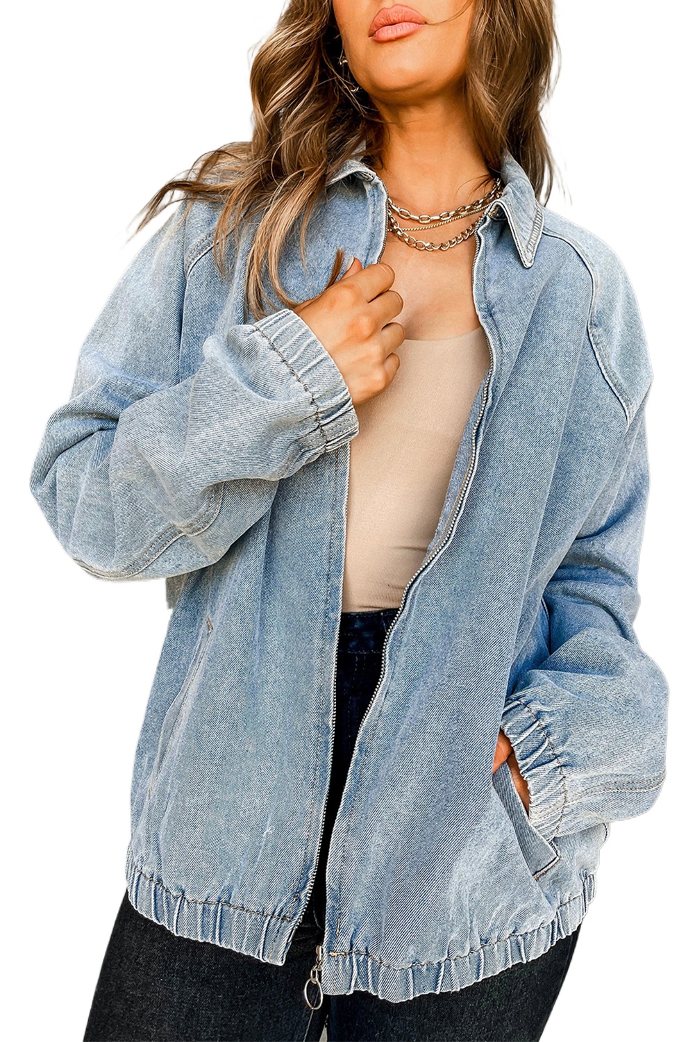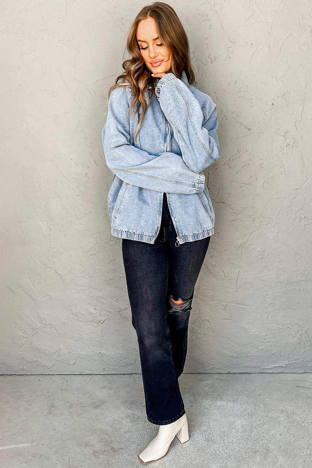 Myosotis Blue Denim Jacket with Elastic Edge Collared Zip Up and Pocket