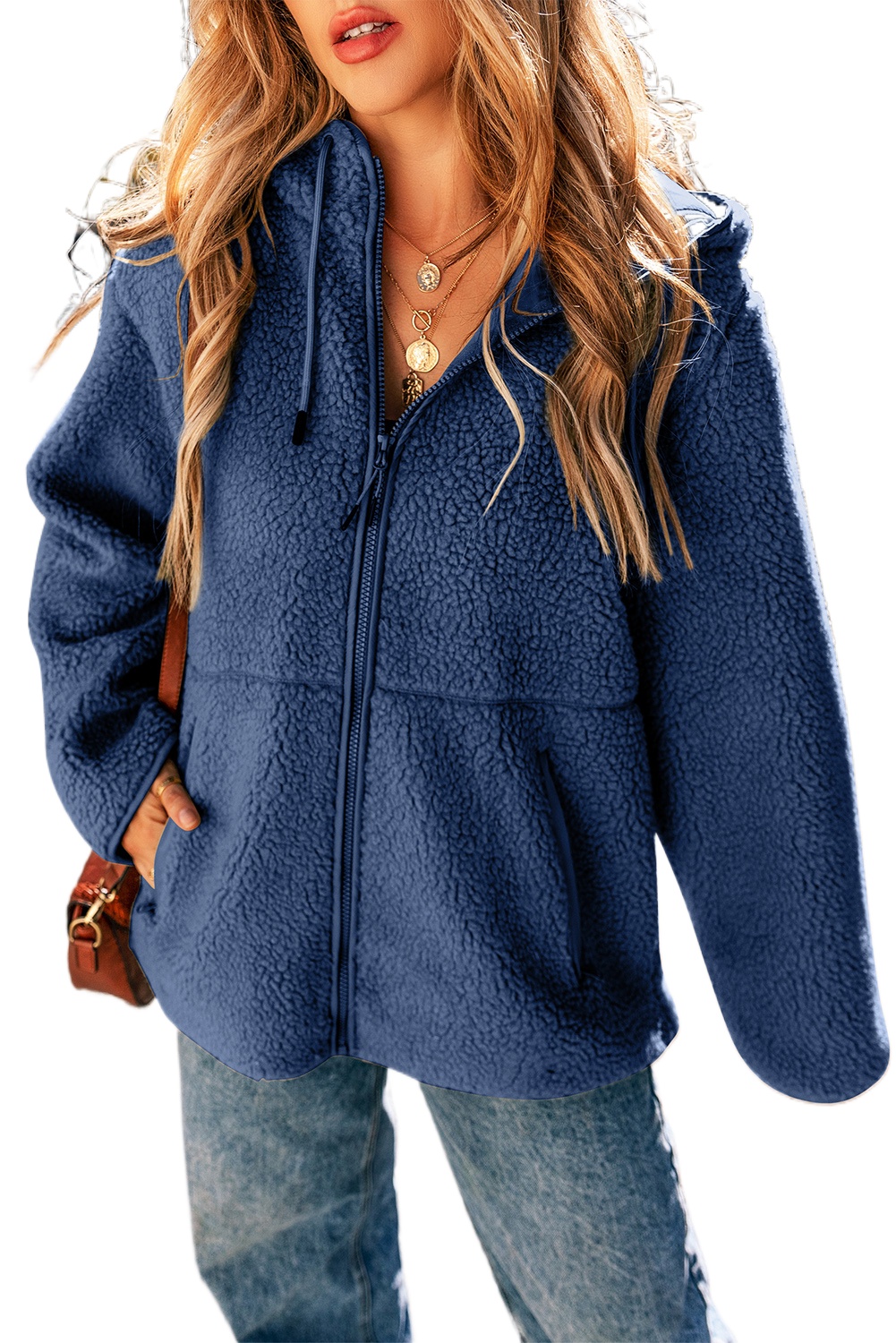 & Free Shipping1. **Cozy and Stylish:** The Navy Blue Fleece Zip Up Drawstring Hooded Pocketed Jacket is crafted from 100% polyester fleece, ensuring warmth and comfort during the crisp fall and winter months.