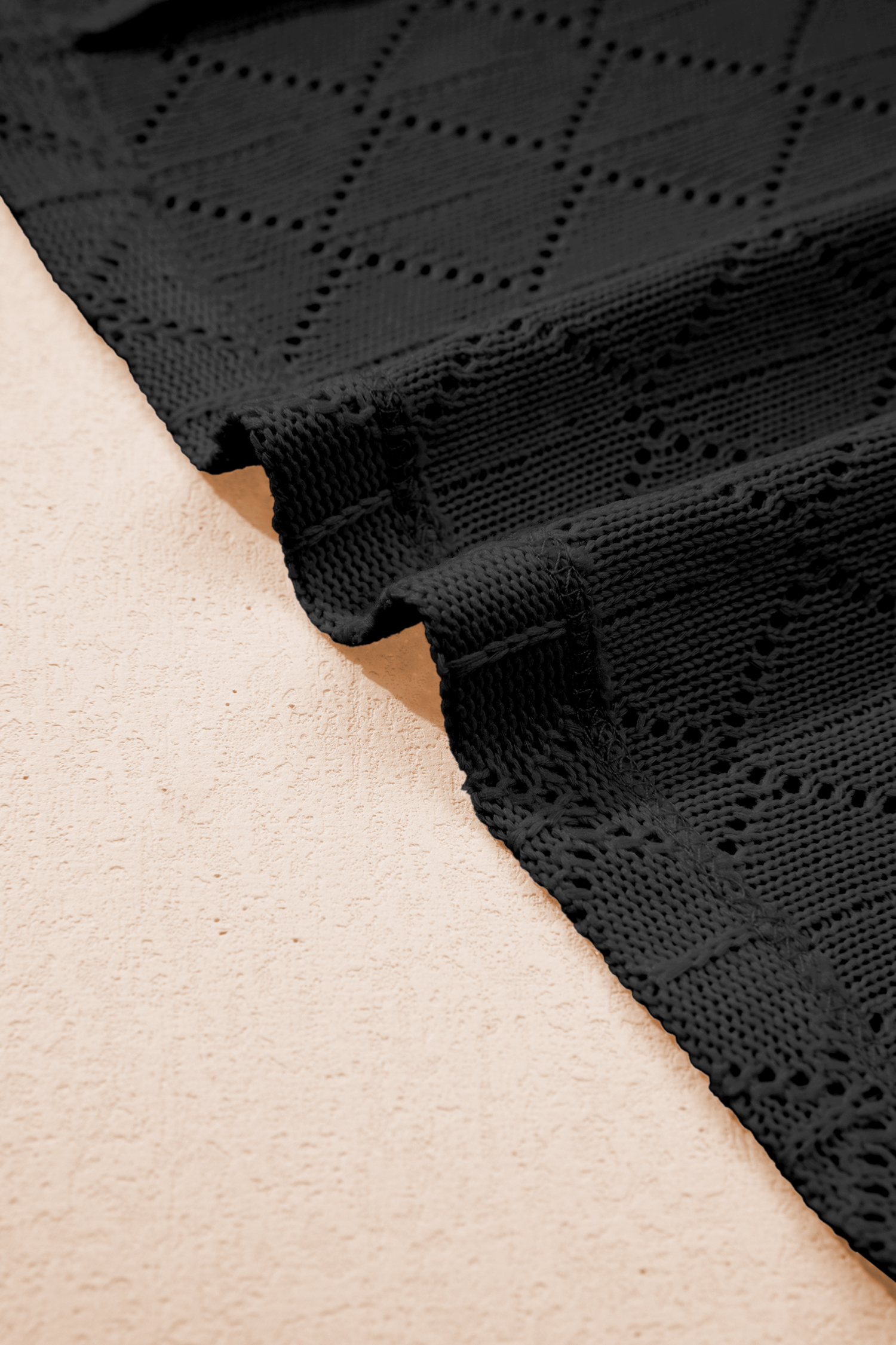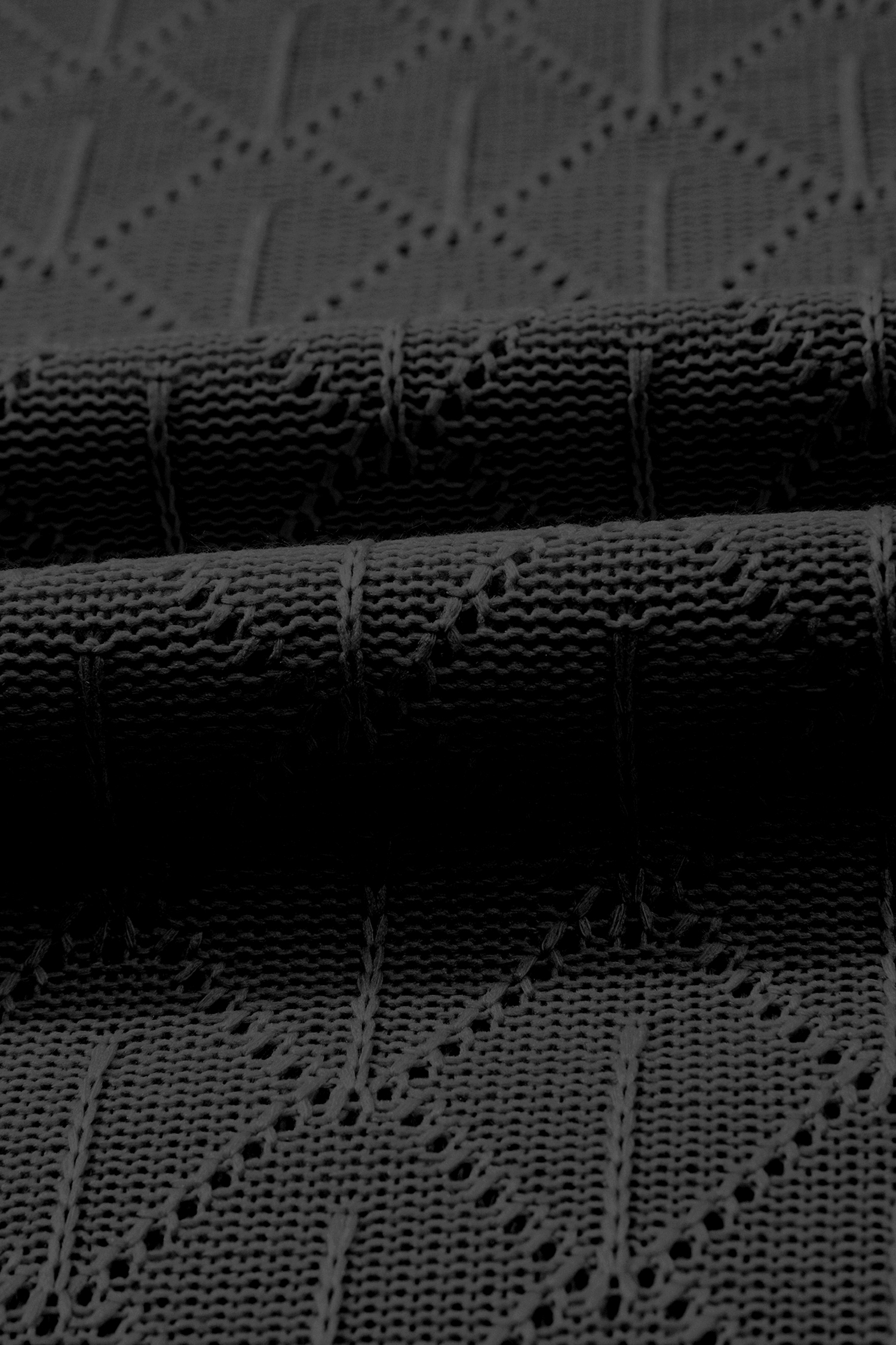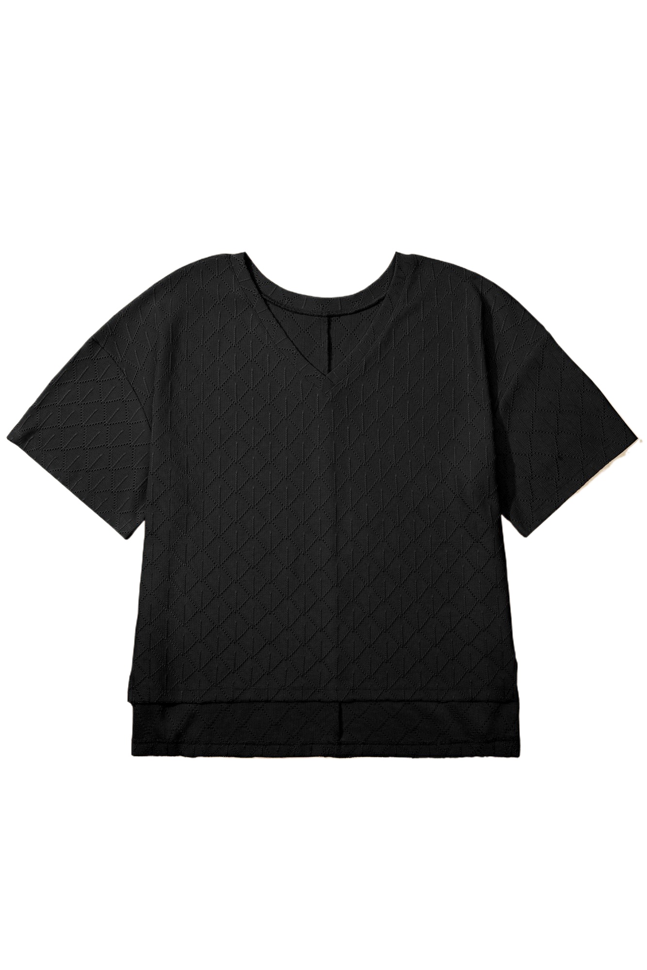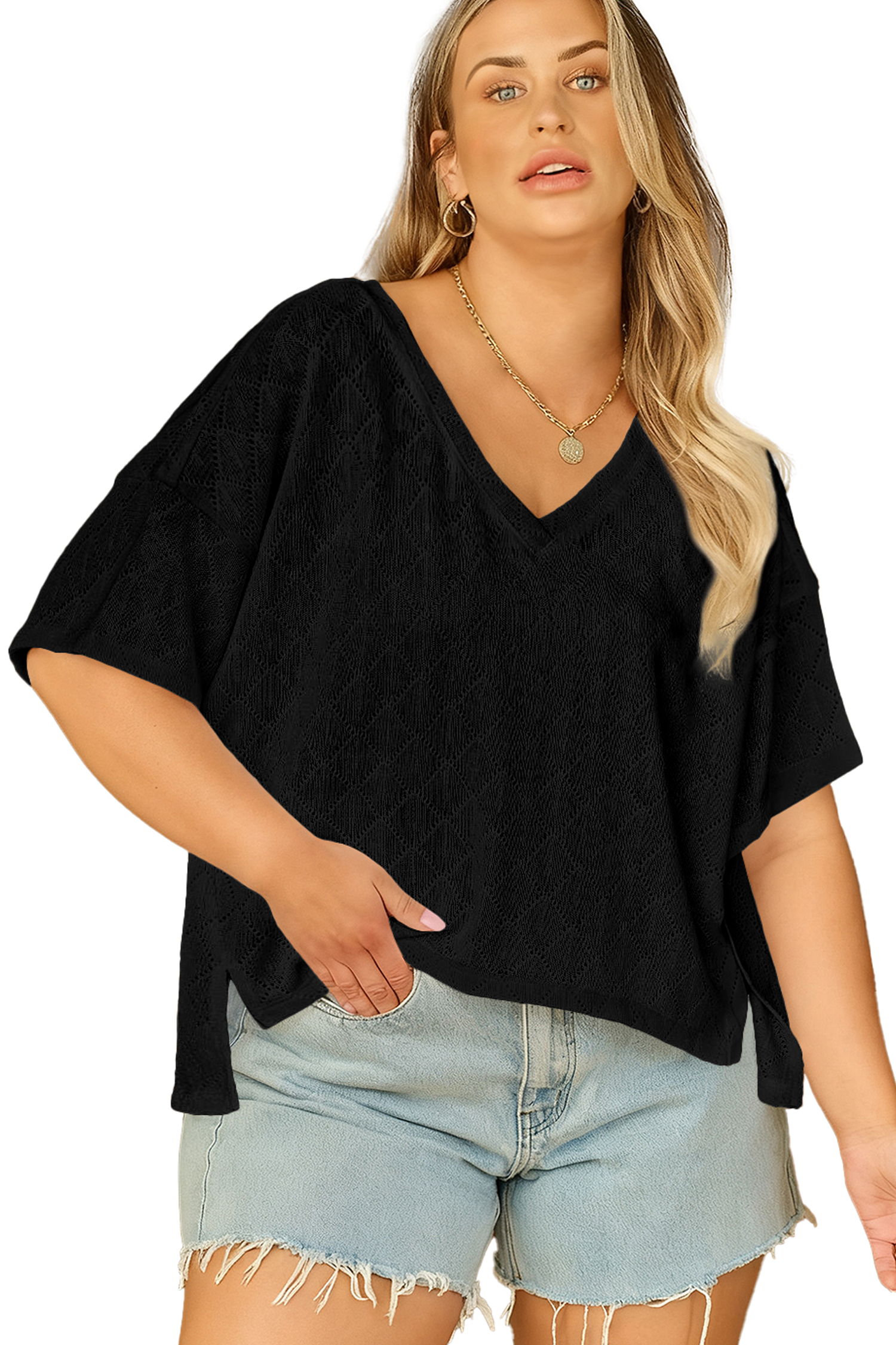 Plus Size Black Pointelle Rhombus Knit V Neck Top – Casual Summer Style for Women