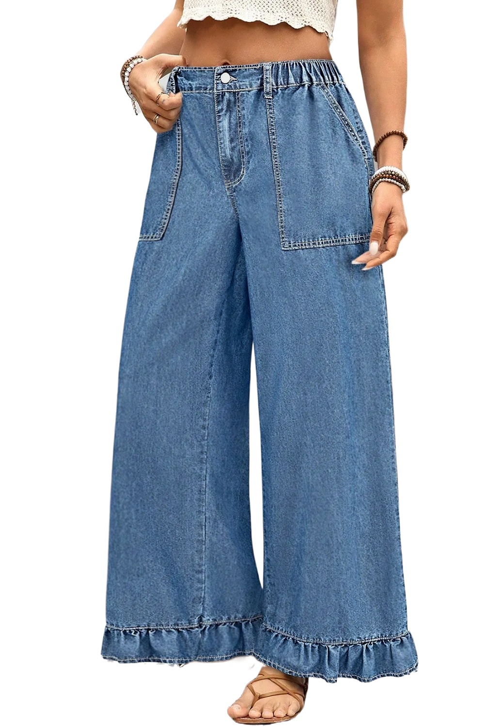Plus Size Women’s Ashleigh Blue Ruffled Wide Leg Denim Pants for Casual Spring Style