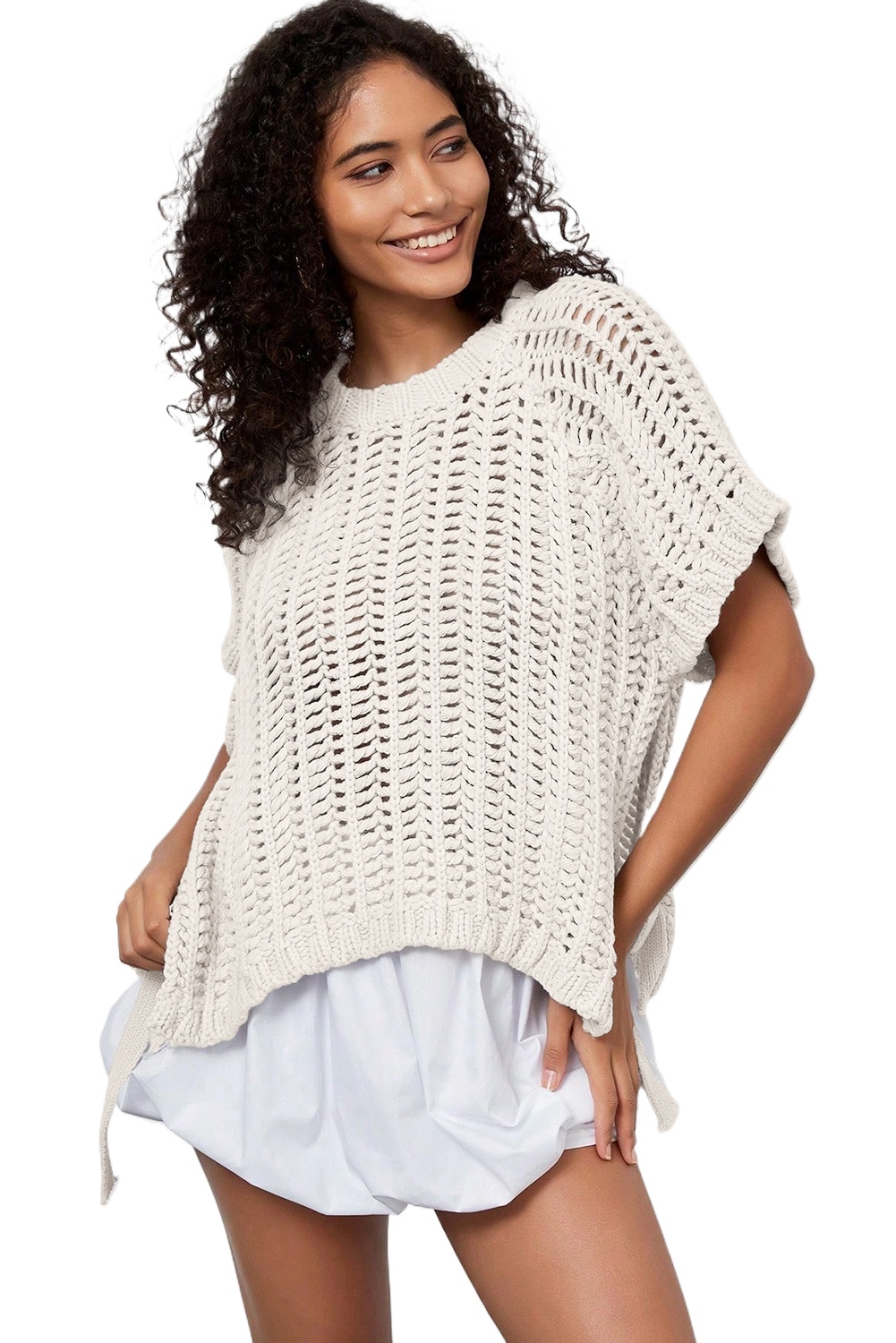 Plus Size Women’s White Open Knit Bow Tie Sweater – Casual Short Sleeve for Summer