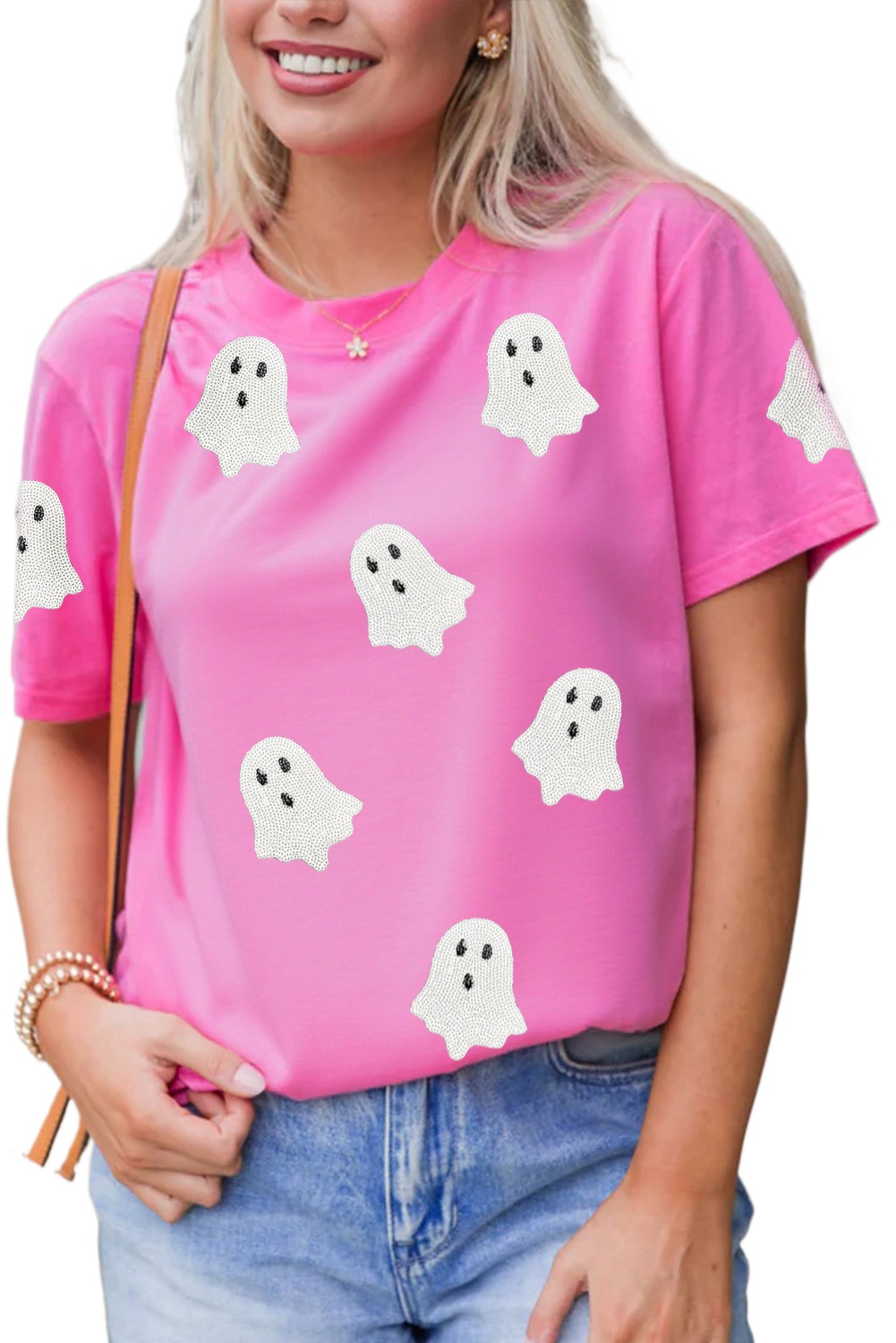 Sachet Pink Sequin Halloween Ghost Patched Casual T-Shirt for Women