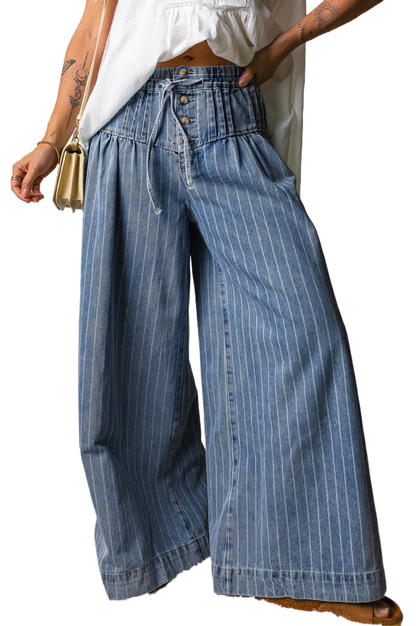 Sky Blue Stripe Casual Wide Leg Jeans for Women – Drawstring Waist, Everyday Comfort