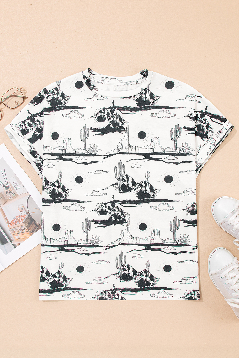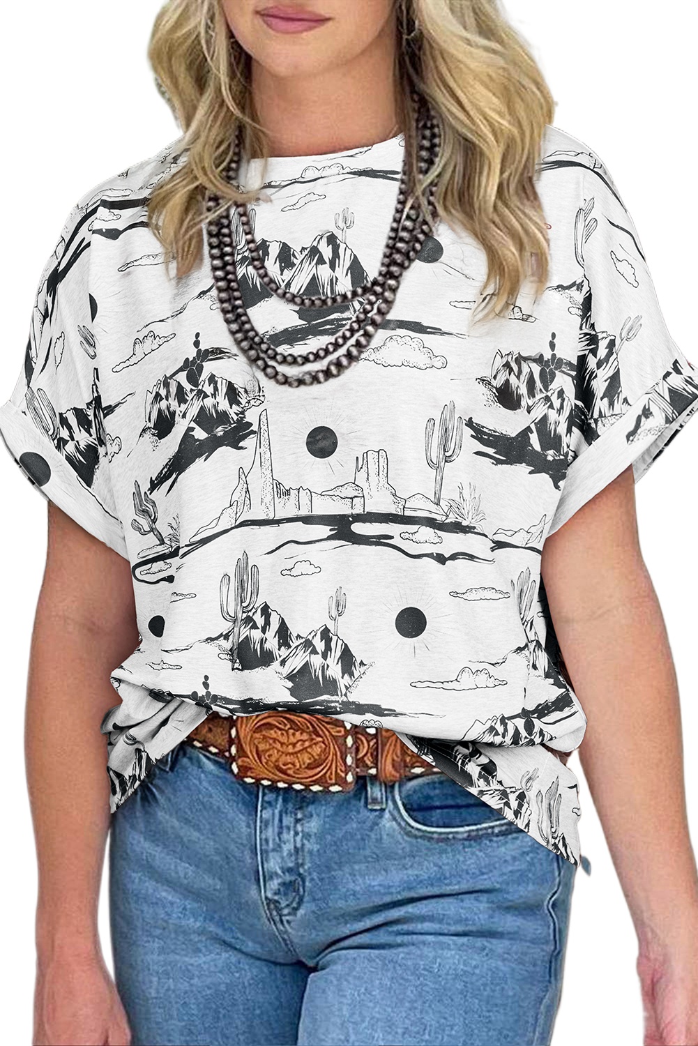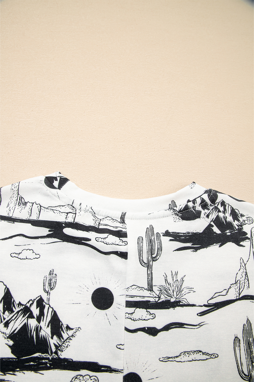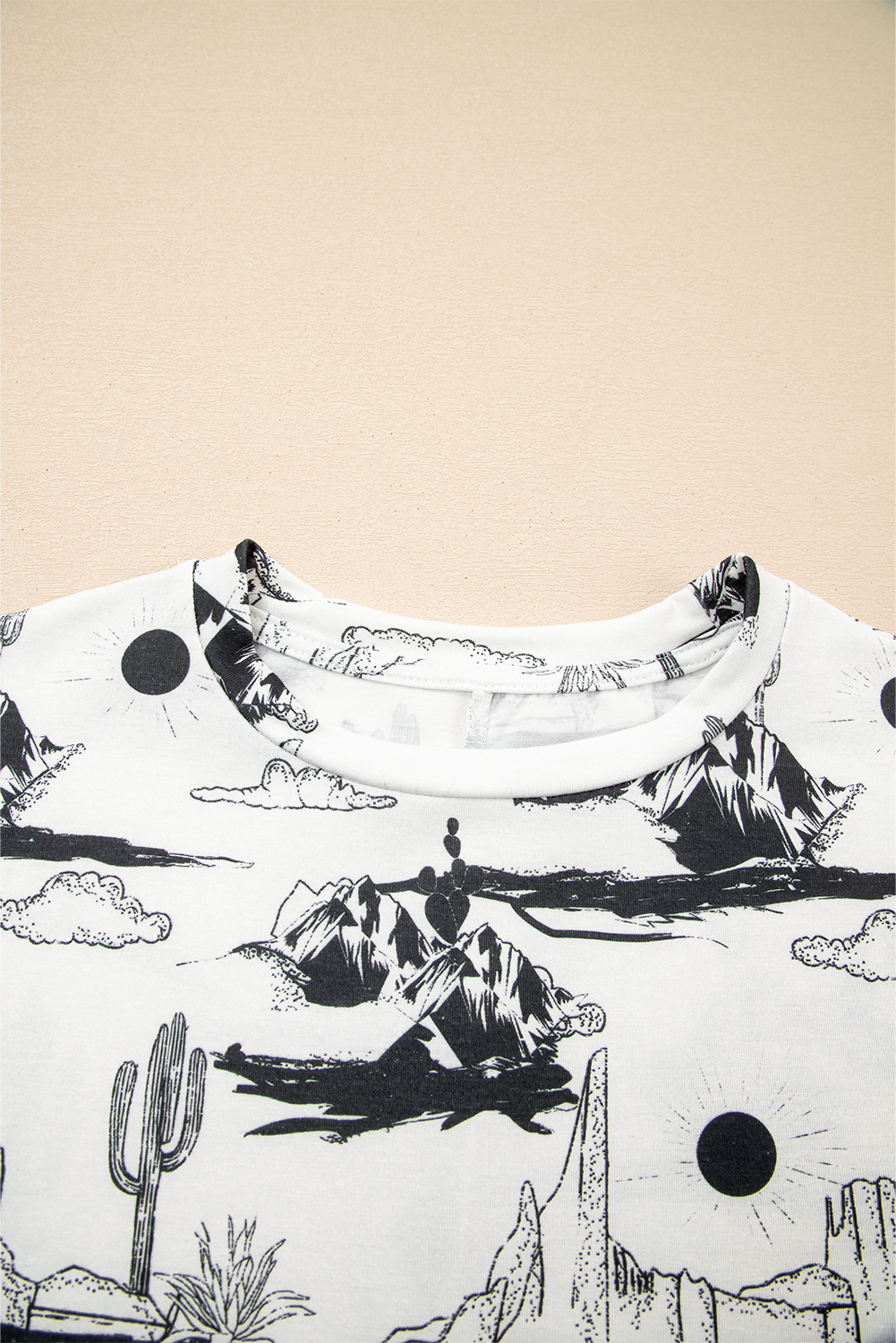 Western Style White Desert Sand Print Short Sleeve Knit Top for Women – Ideal for Summer Outings