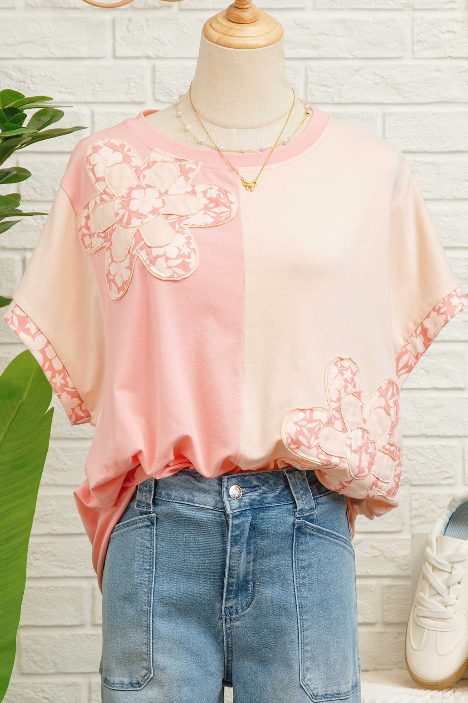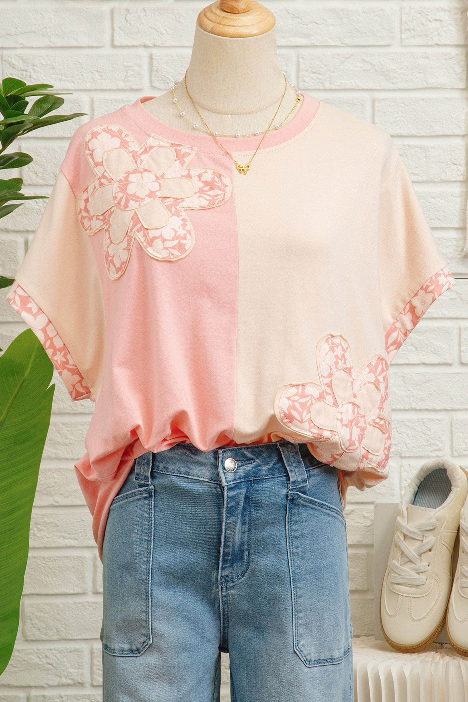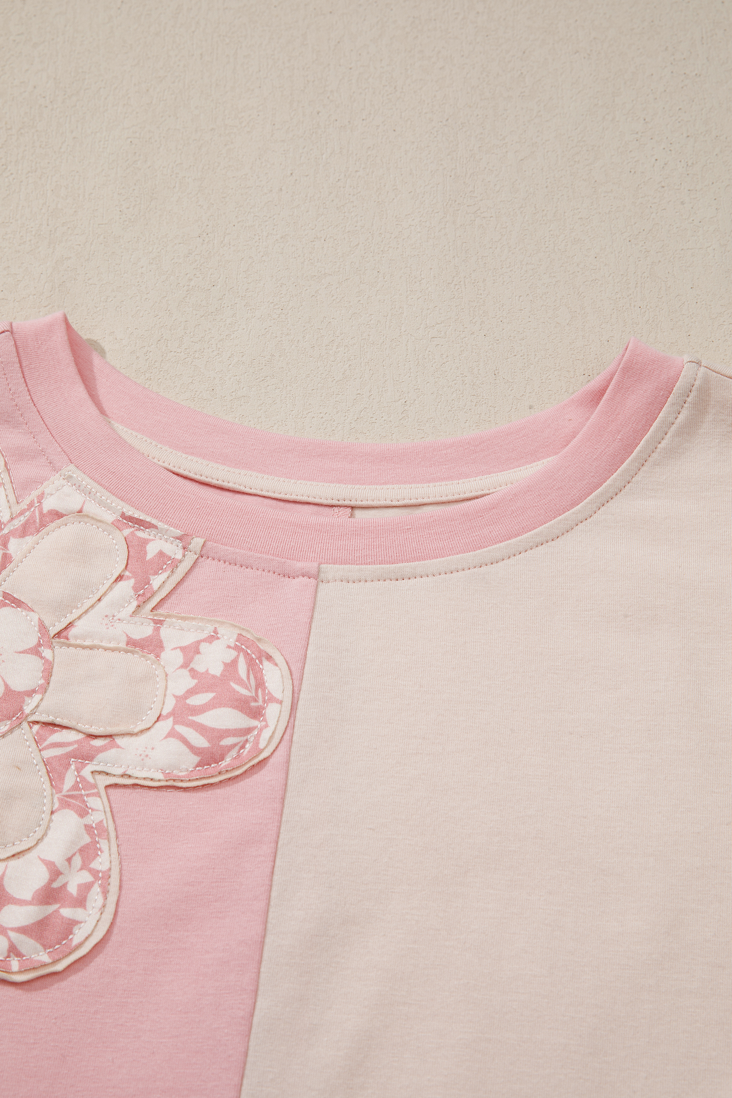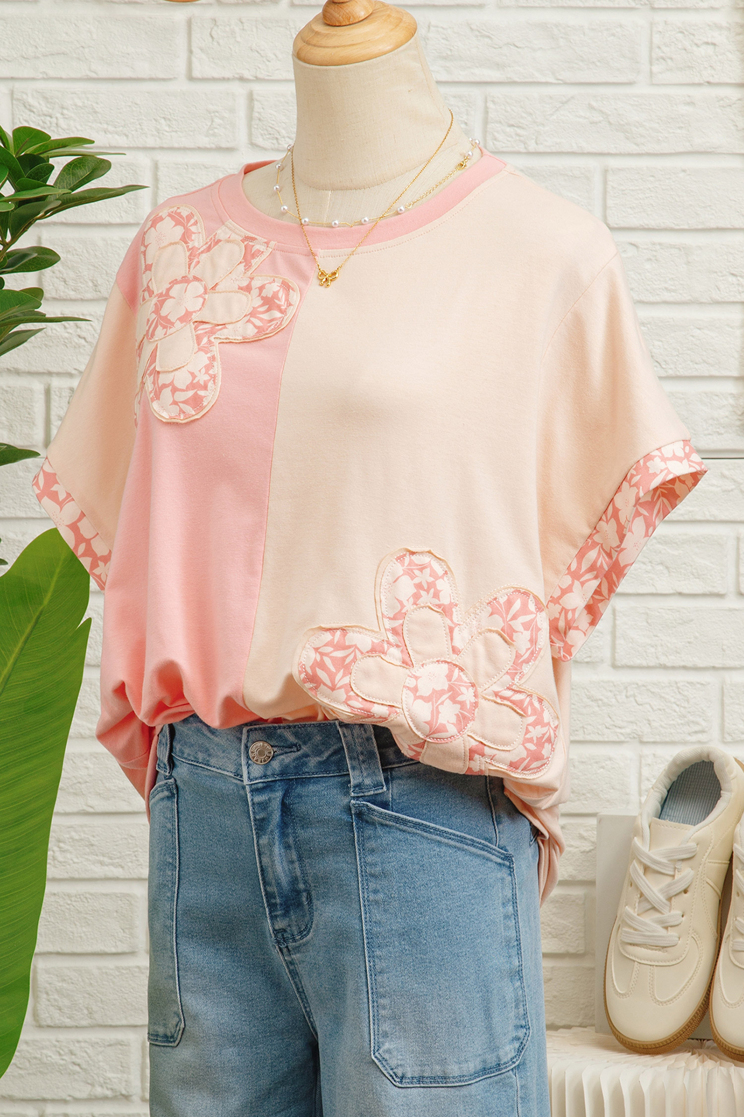 Women’s Apricot Color Block T-Shirt – Floral Patchwork Loose Fit Top for Casual Daily Wear