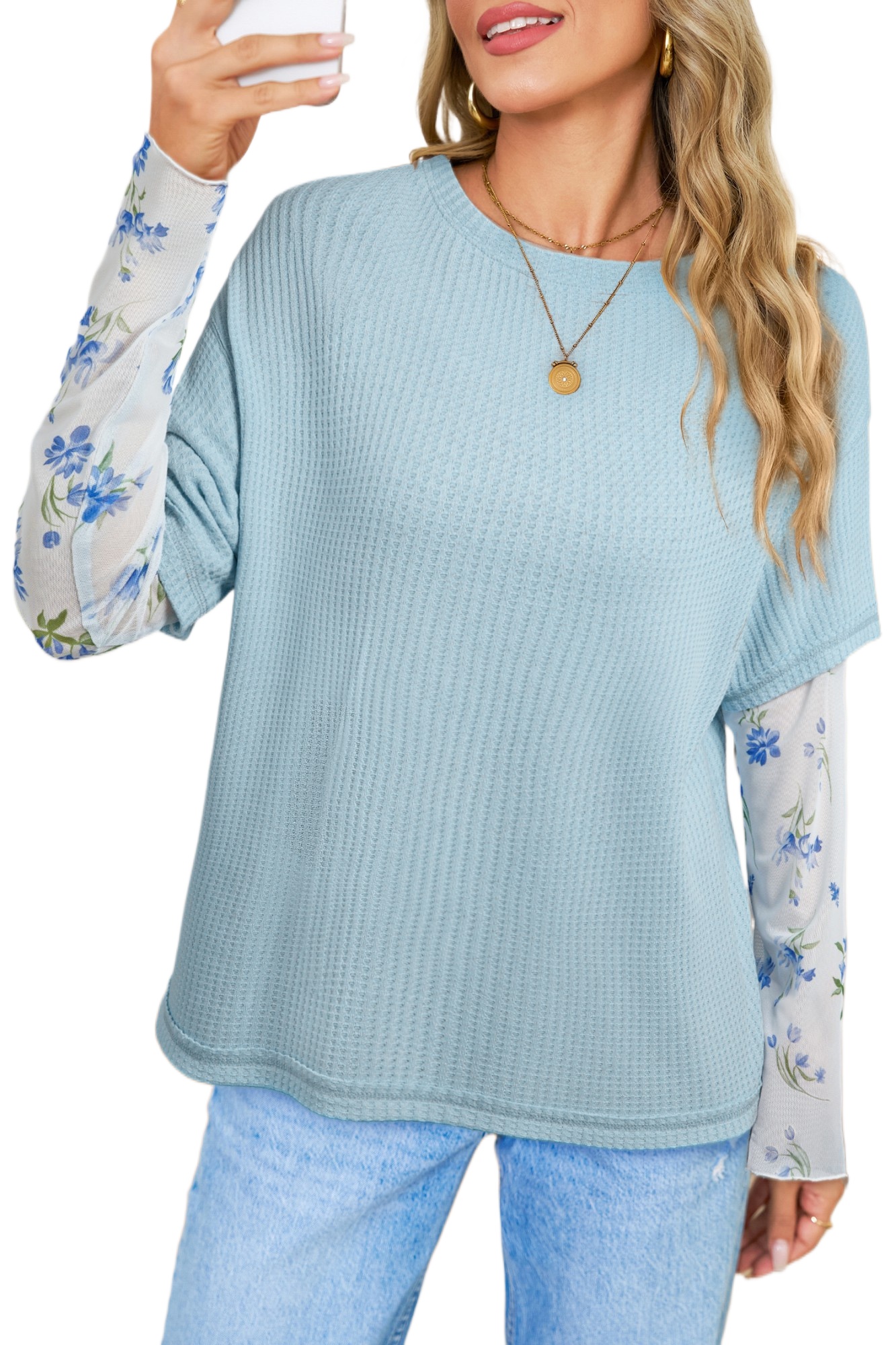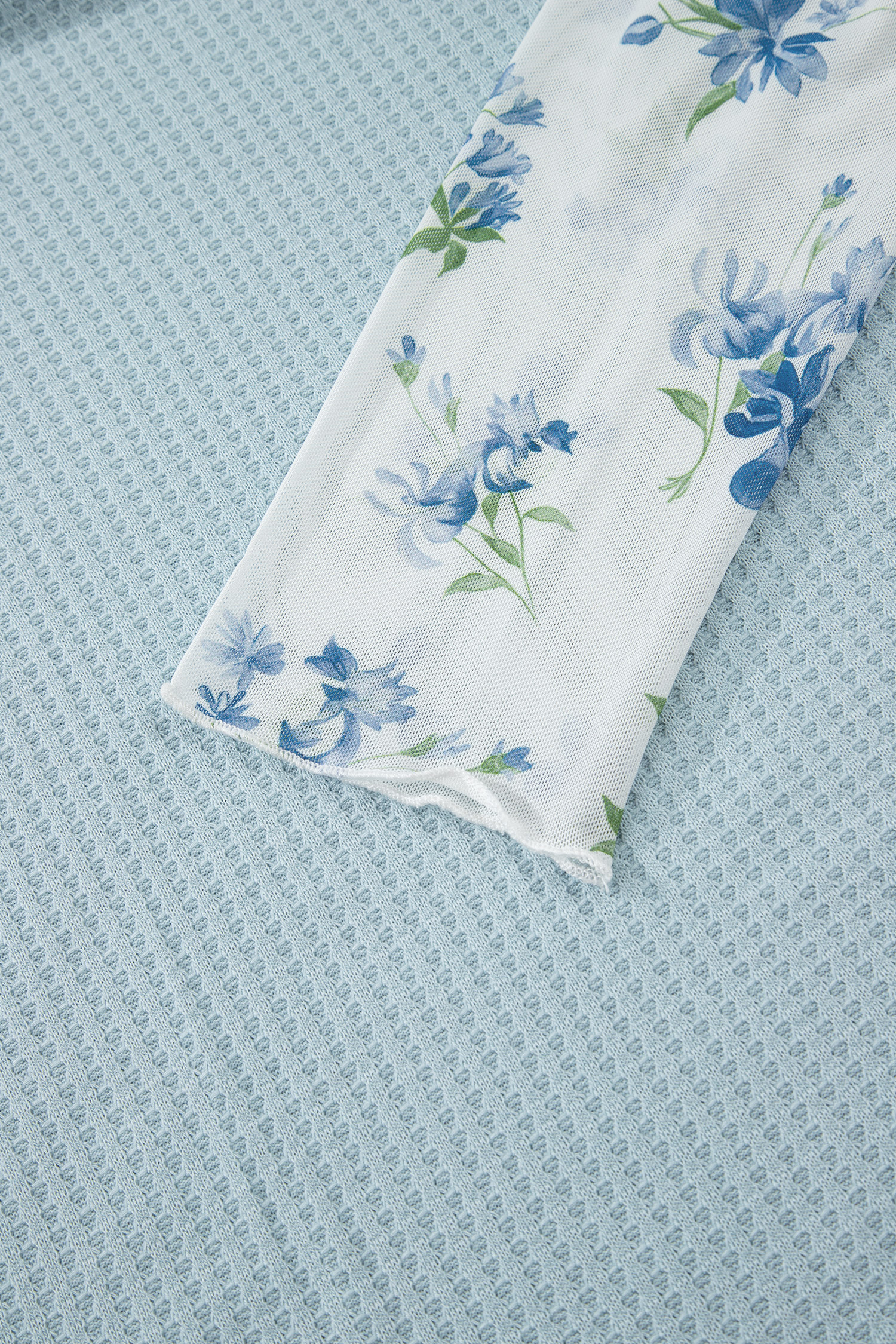 Women’s Beau Blue Floral Lace Sleeve Top – Elegant Patchwork Design for Daily Wear