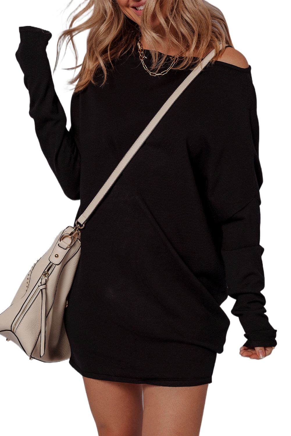 Women’s Black Asymmetric Neck Batwing Sleeve Mini Sweater Dress – Casual Autumn Style