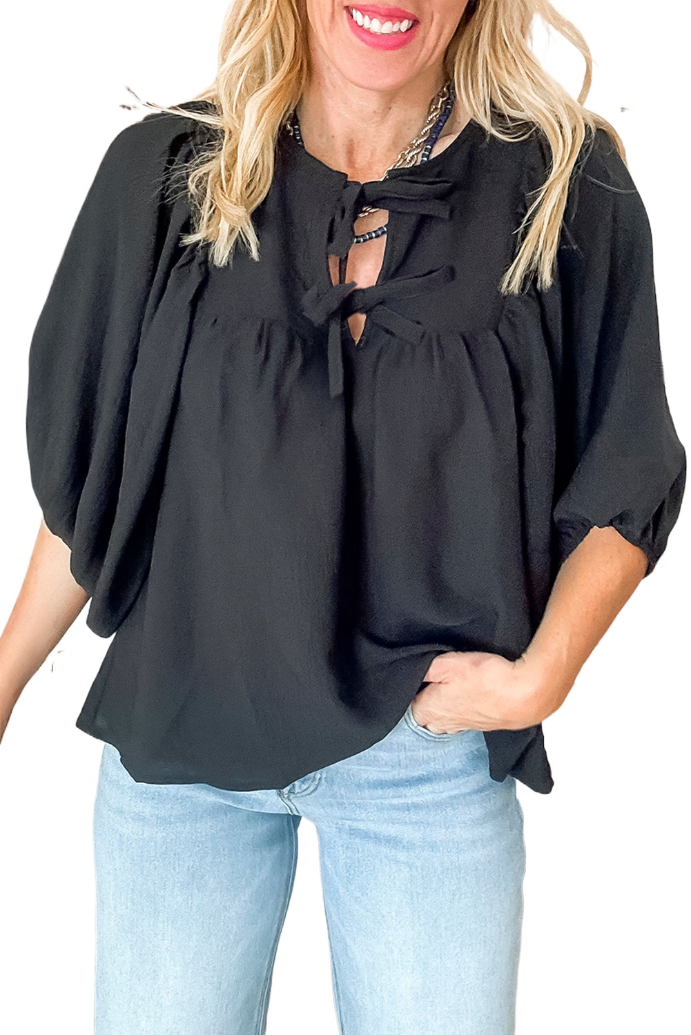 1. Elegant Bow Tie Design: The Black Bow Tie Neck 3/4 Sleeve Casual Blouse features a charming bow tie neckline that adds a touch of sophistication to your casual wardrobe.