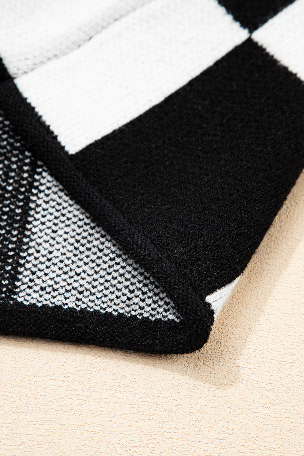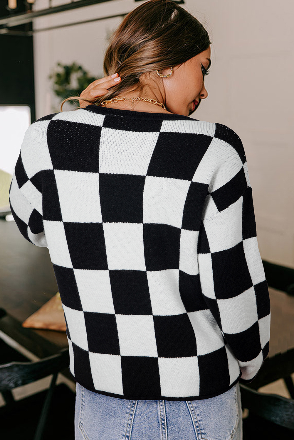 Women’s Black Checked Notched Neckline Drop Shoulder Knit Sweater – Casual Fall Fashion
