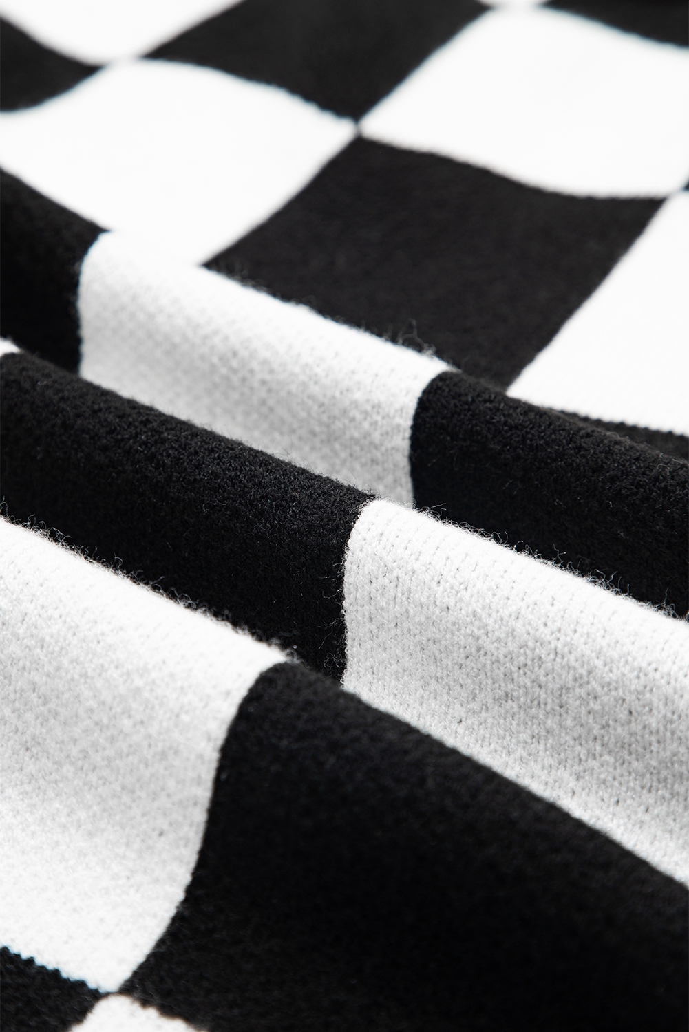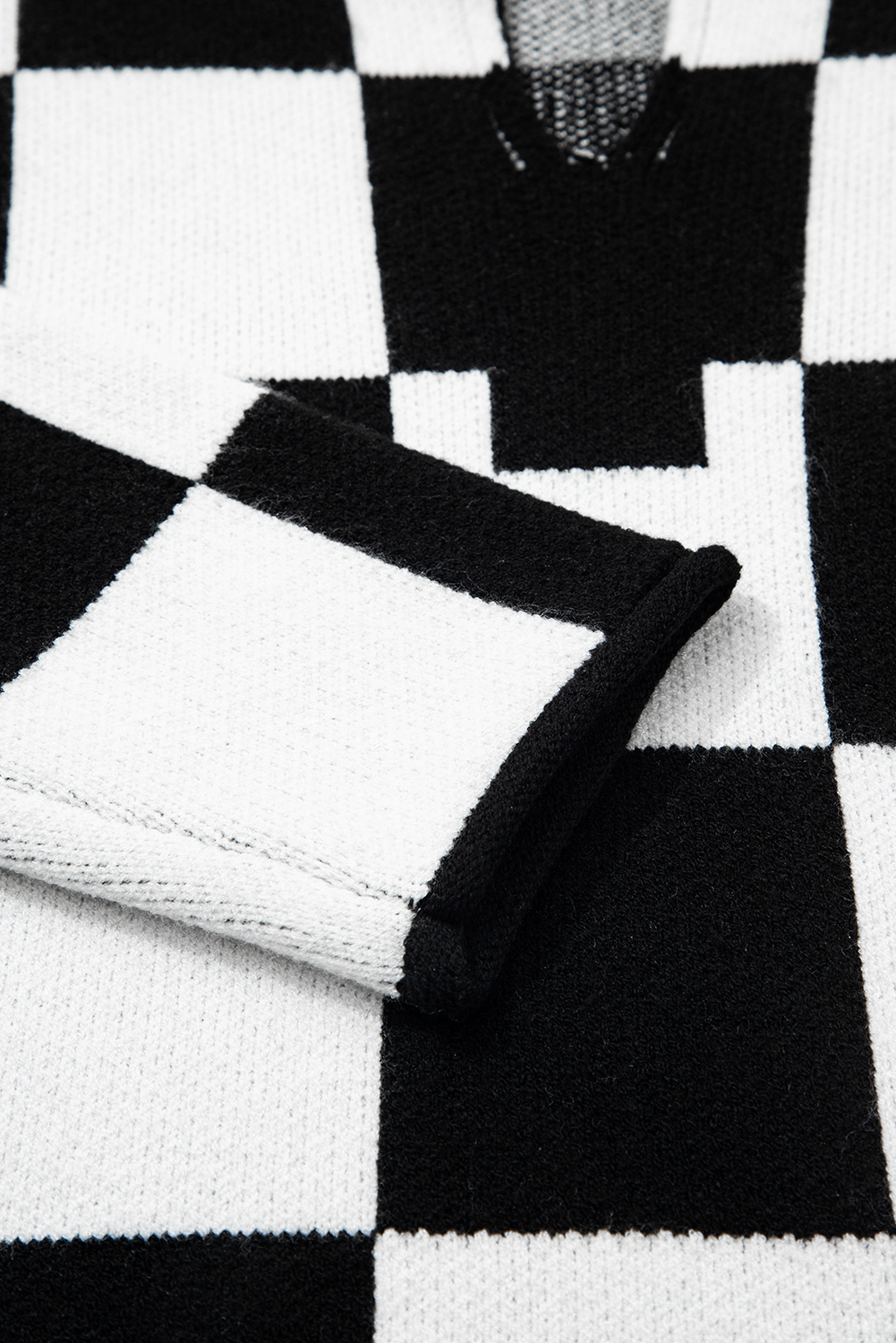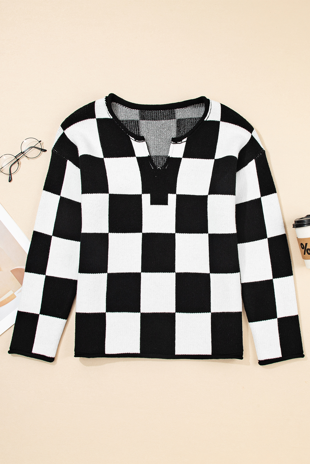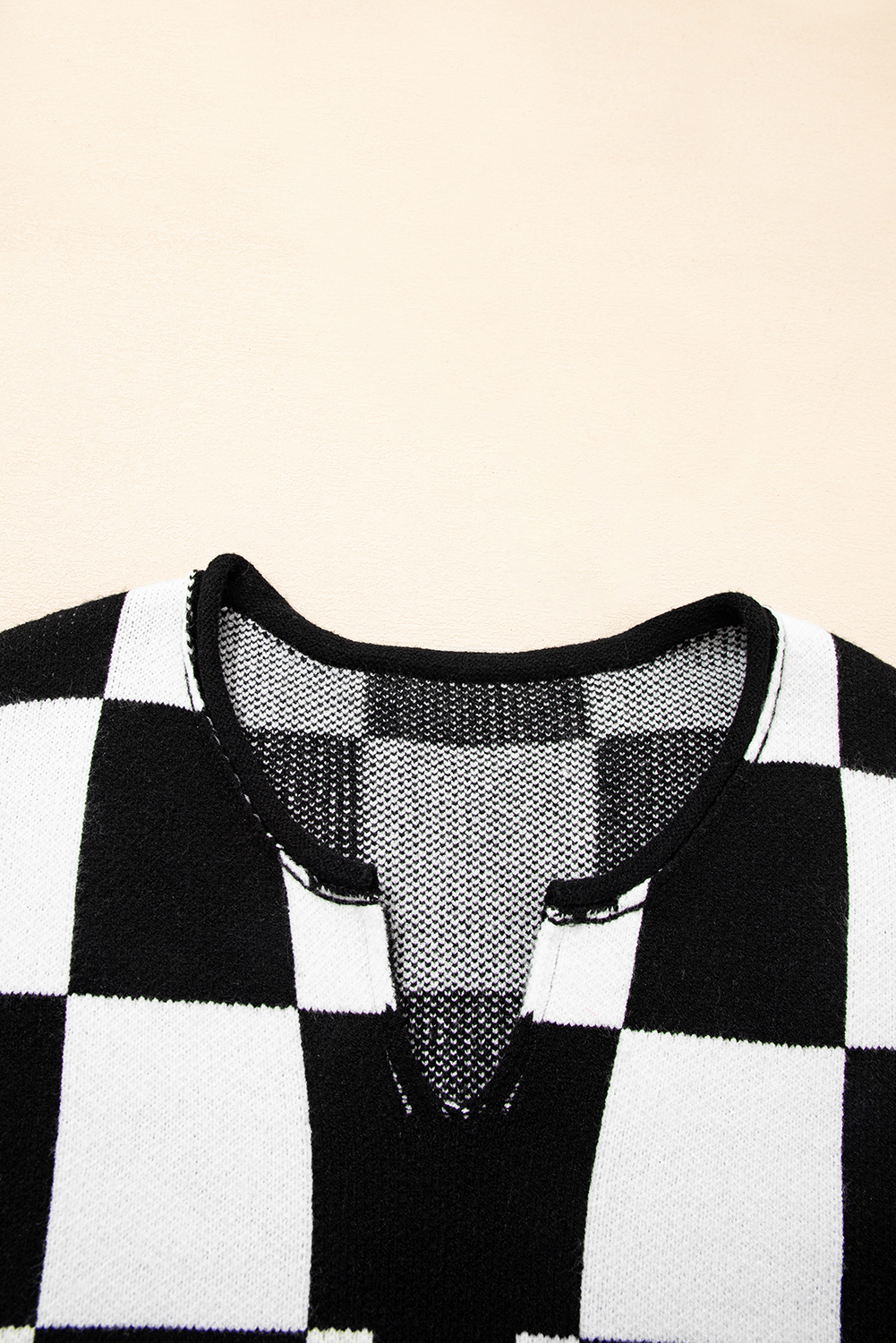1. Trendy Checked Design: The Black Checked Notched Neckline Drop Shoulder Knit Sweater features a stylish plaid pattern that adds a touch of sophistication to your casual wardrobe.