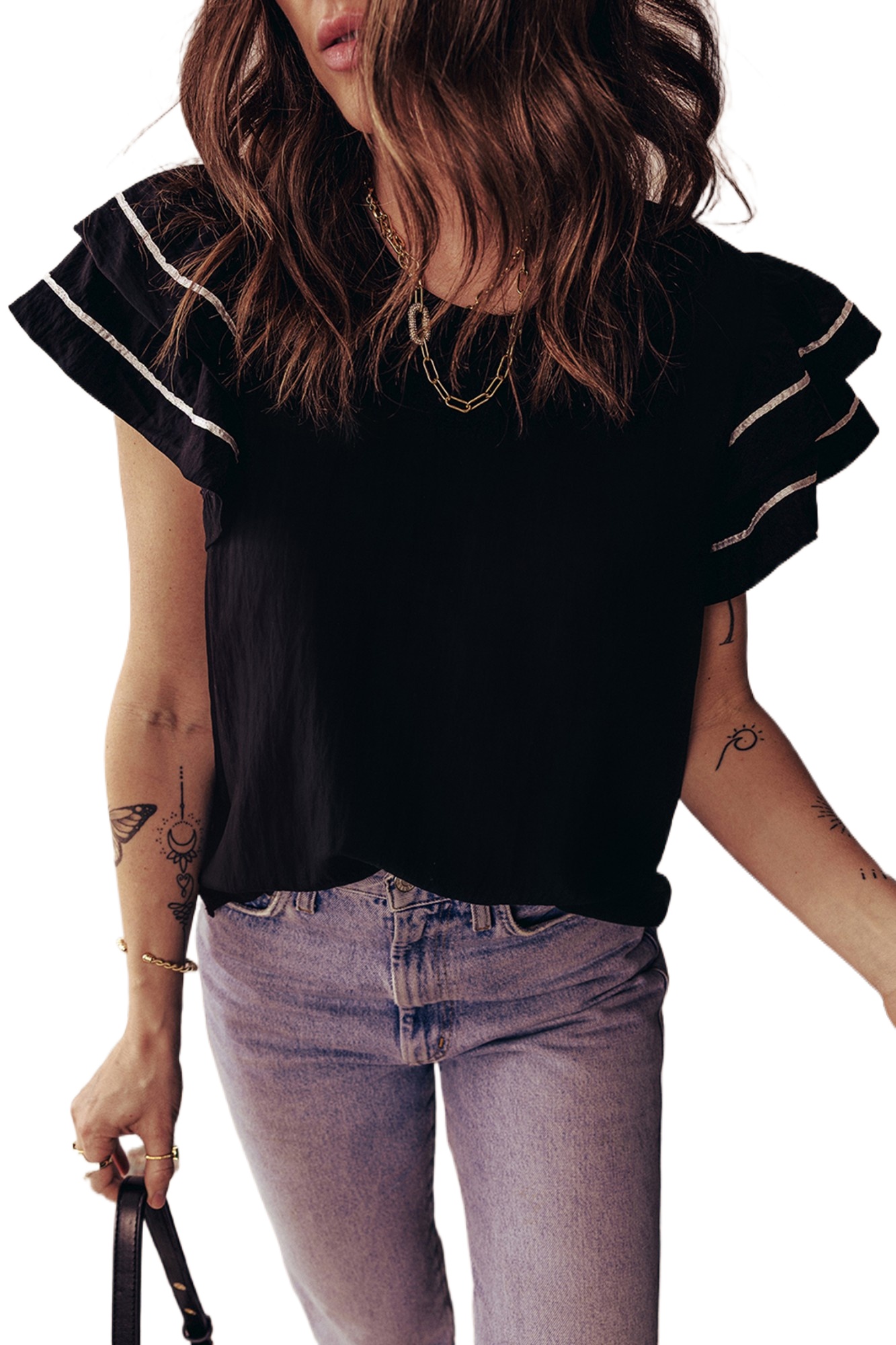Women’s Black Contrast Trim Ruffle Blouse – Elegant Short Sleeve Top for Daily Wear
