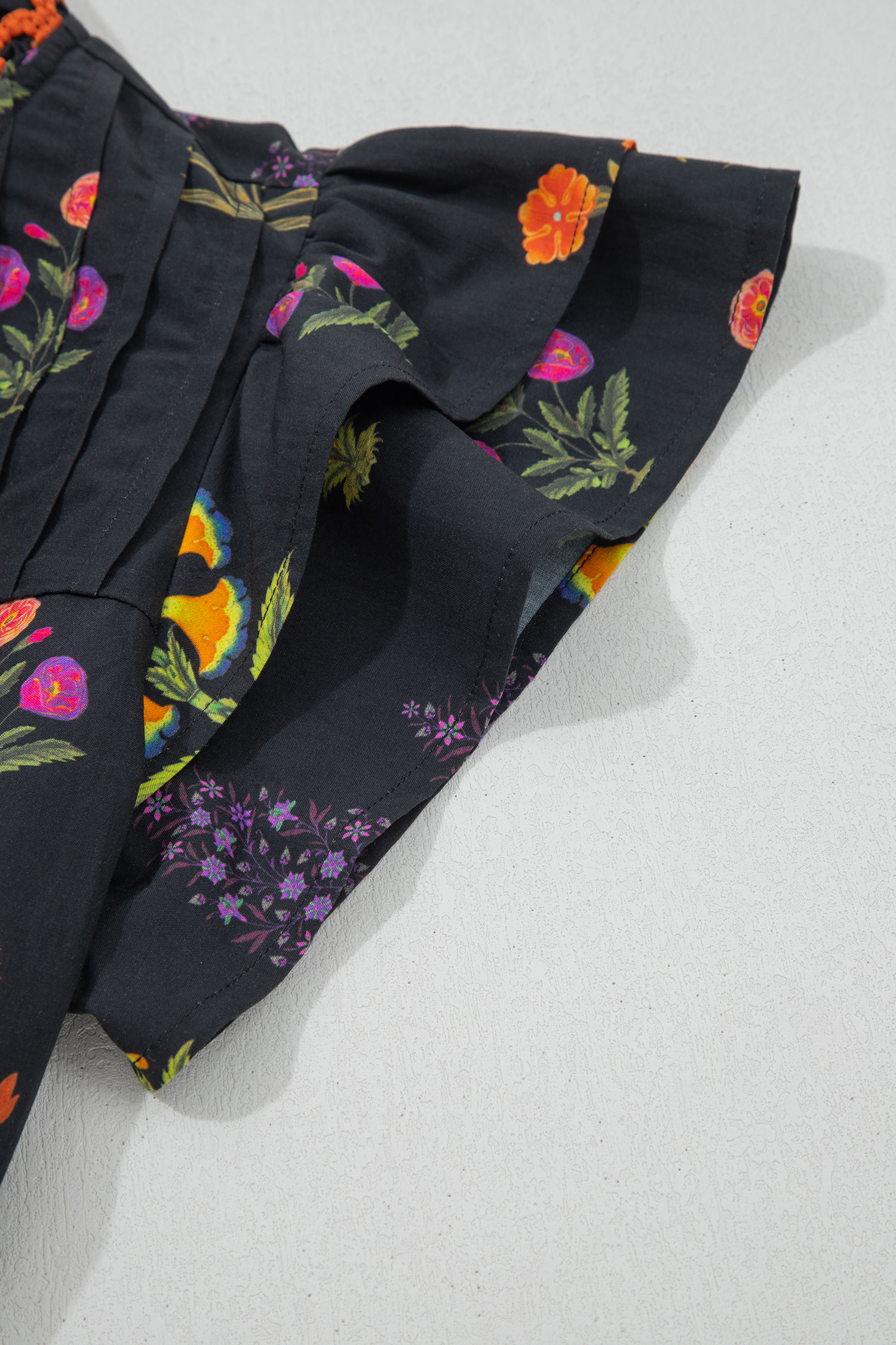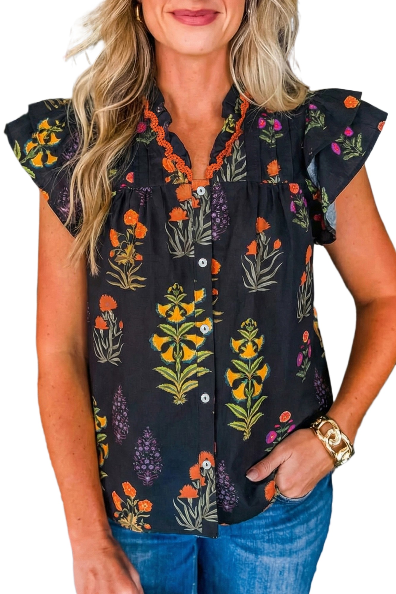 Women’s Black Floral Print Lace Trim Frilled V Neck Short Sleeve Shirt for Casual Days