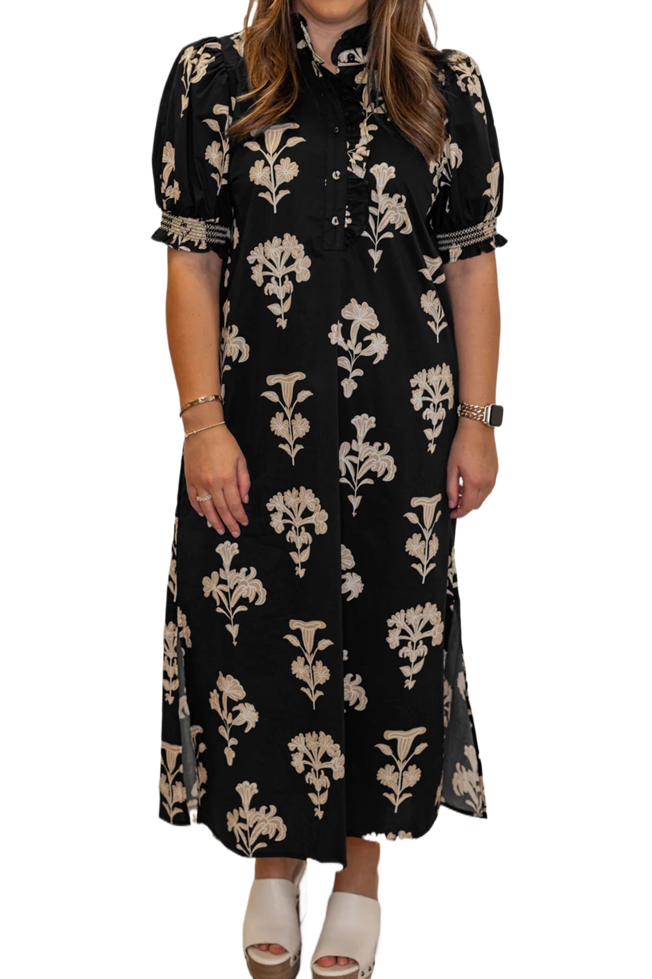 Women’s Black Floral Print Maxi Dress – Short Puff Sleeves for Casual Summer Elegance
