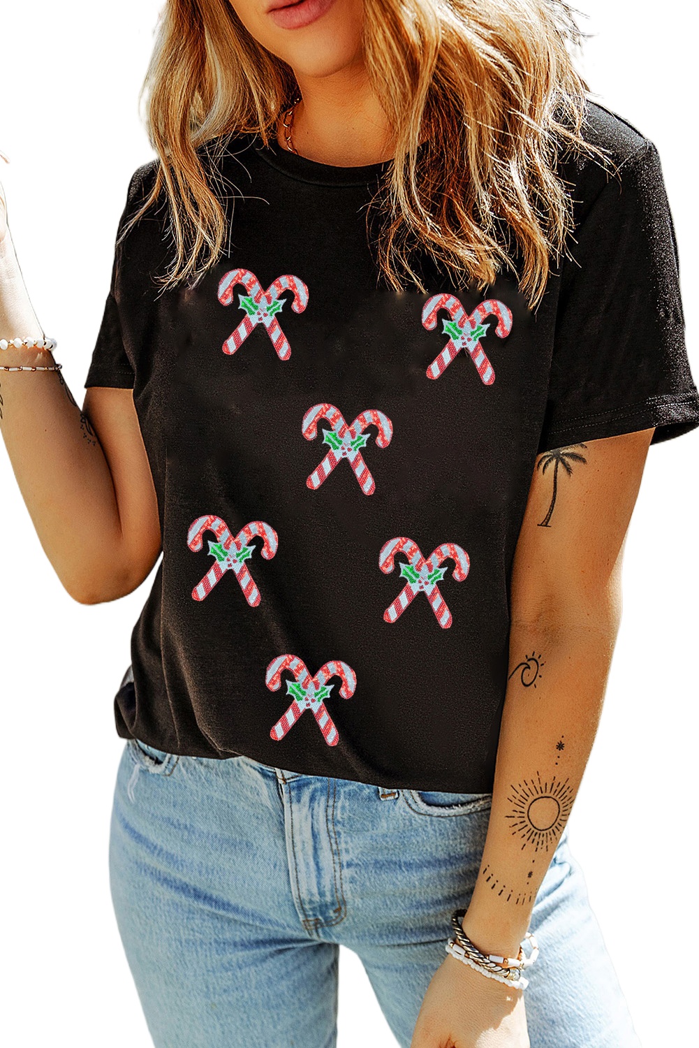Women’s Black Holly Candy Cane Sequin Graphic T-Shirt – Festive Casual Christmas Wear