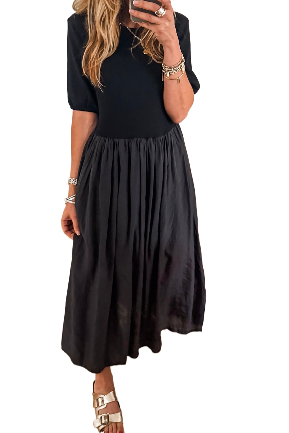 Women’s Black Patchwork Pleated Long Dress – Casual Summer Style with Half Sleeves