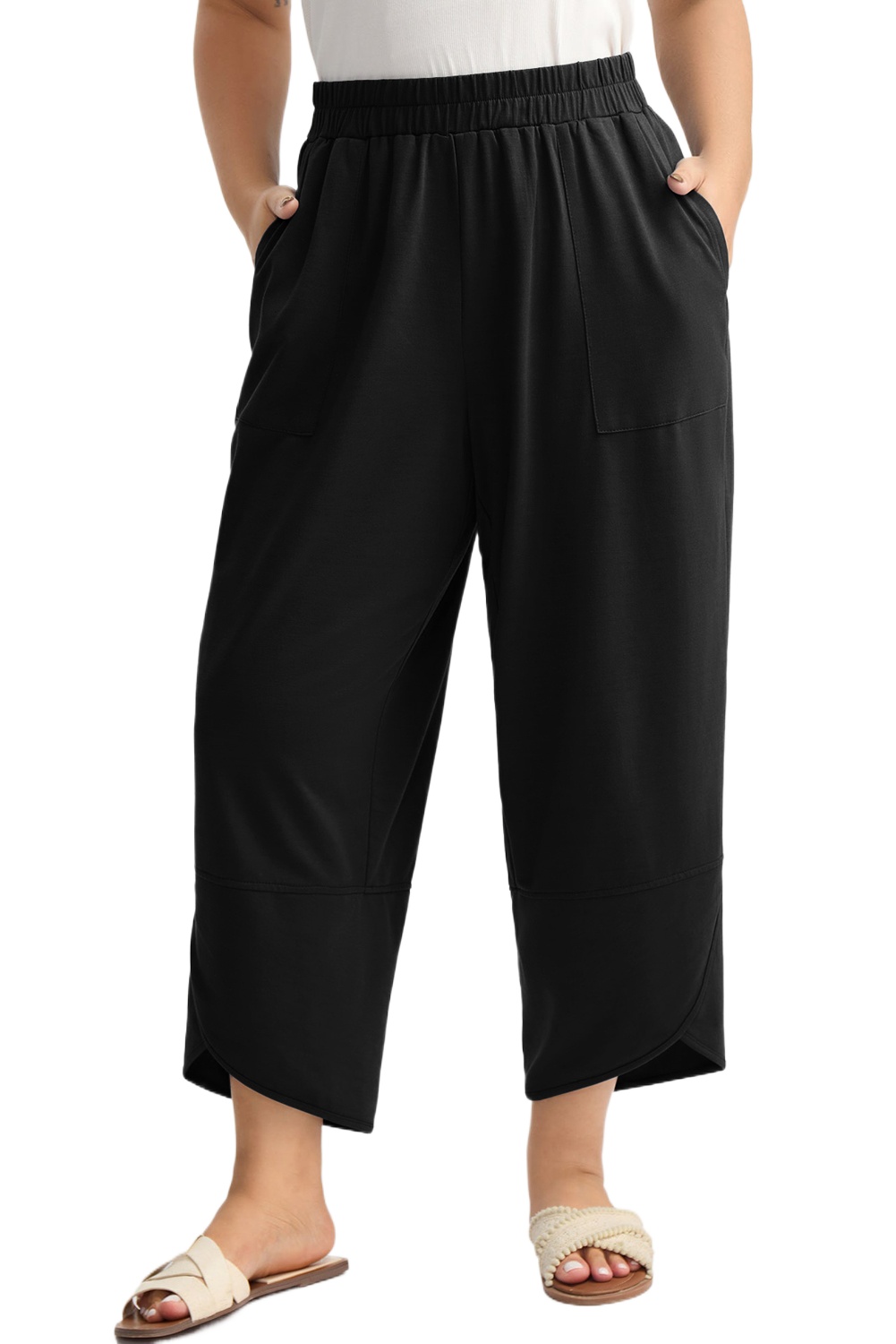 Women's Black Plus Size Loose Capris Pants – Casual High Waist with Asymmetrical HemWomen’s Black Plus Size Loose Capris Pants – Casual High Waist with Asymmetrical Hem