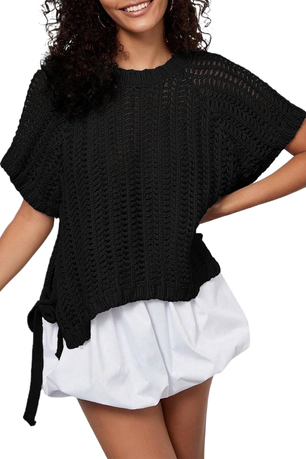 Women’s Black Plus Size Open Knit Bow Tie Short Sleeve Sweater – Casual Summer Style