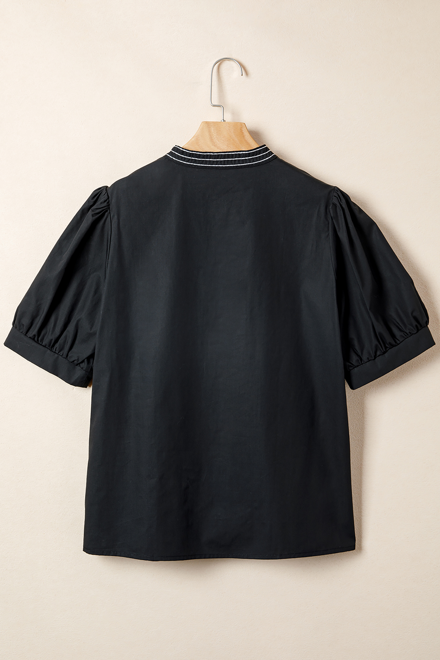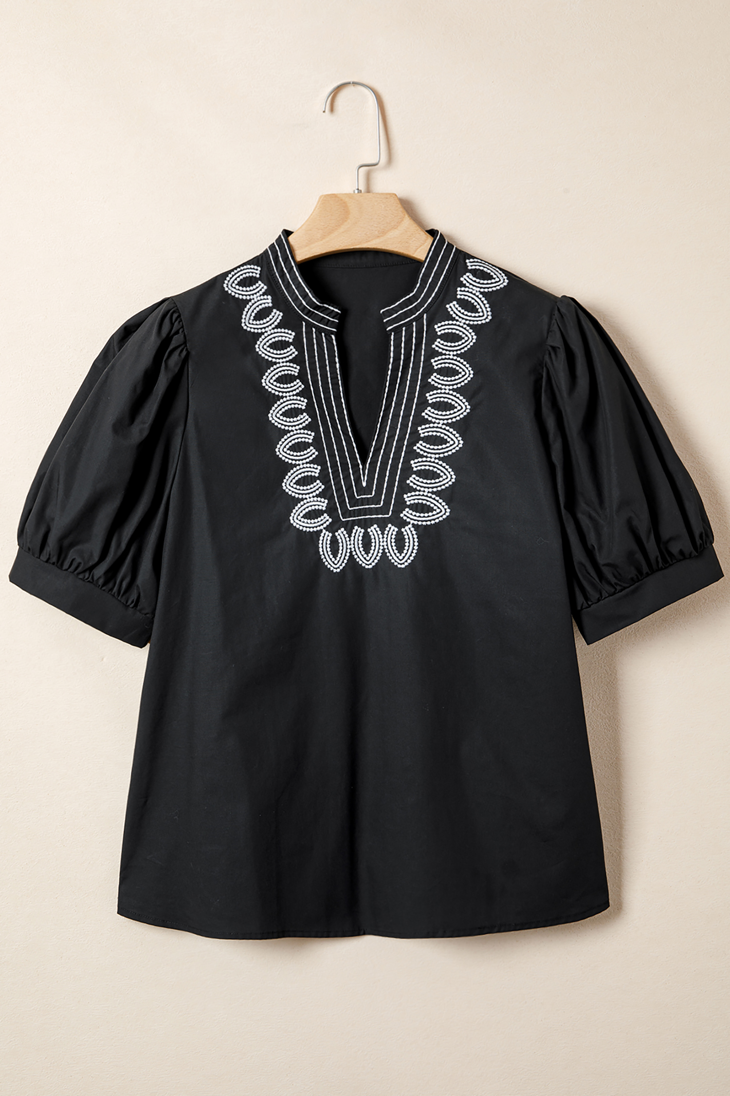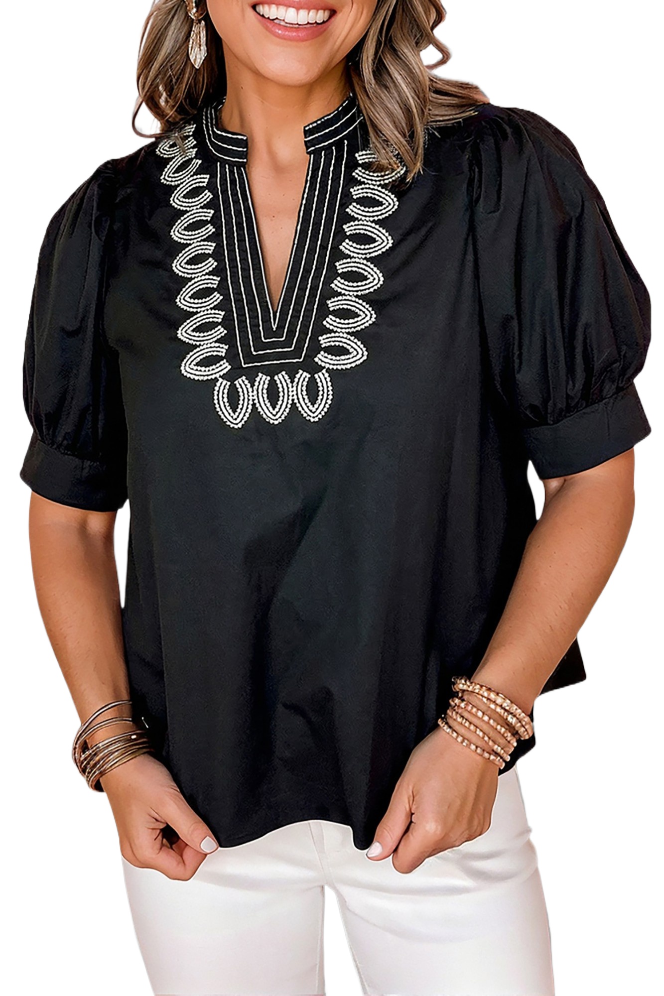 Women's Black Puff Sleeve V Neck Blouse with Embroidered Detail – Casual Summer StyleWomen’s Black Puff Sleeve V Neck Blouse with Embroidered Detail – Casual Summer Style