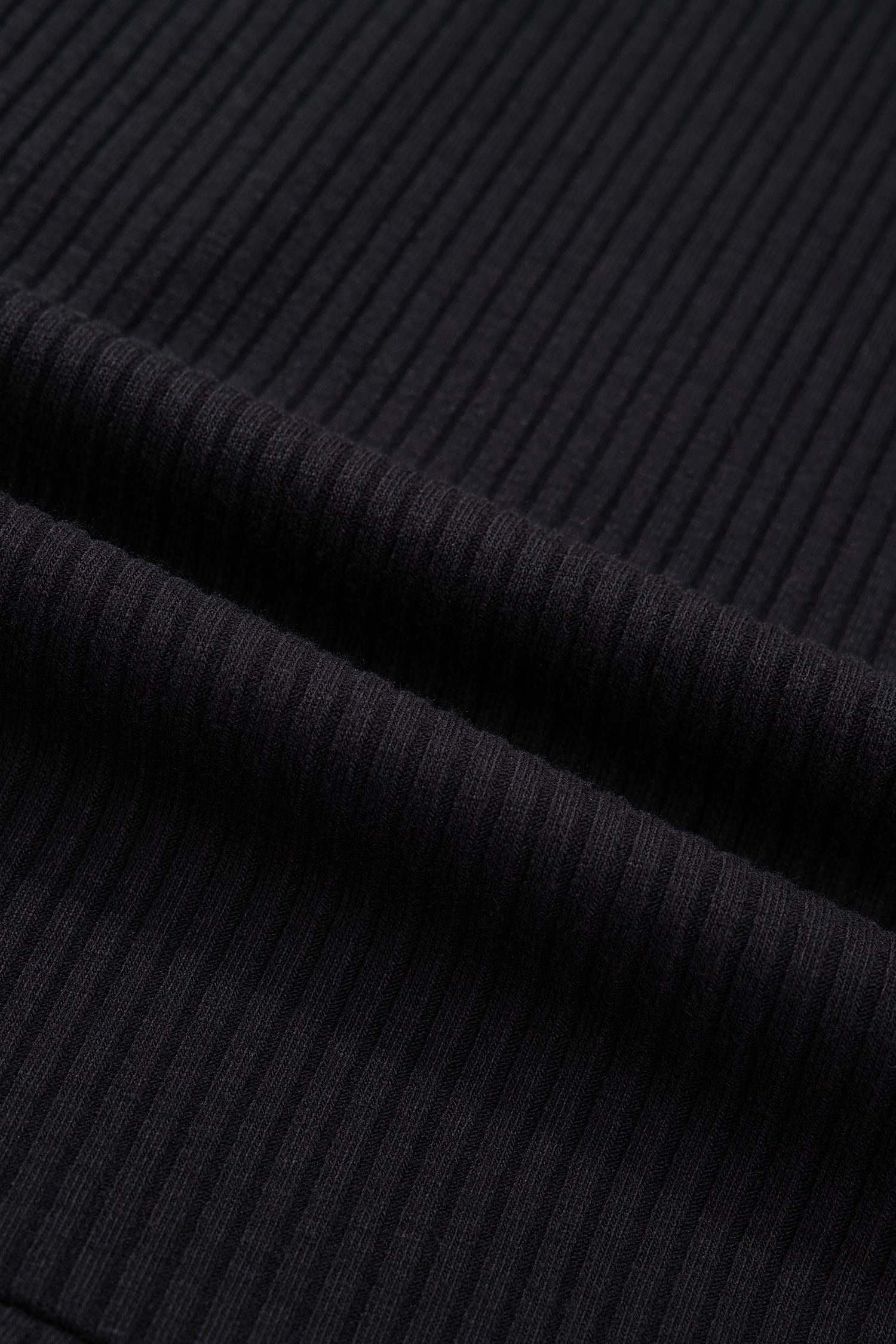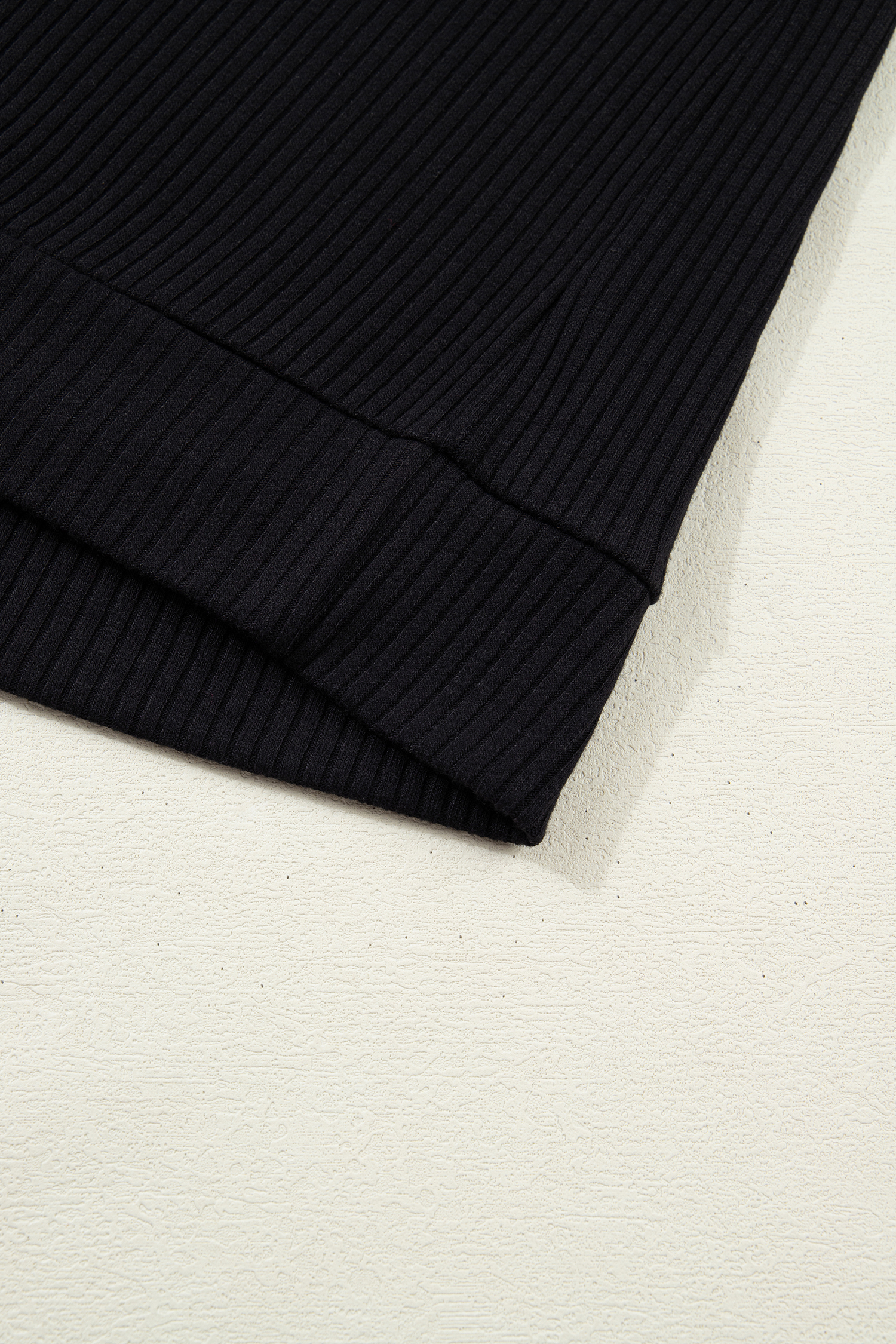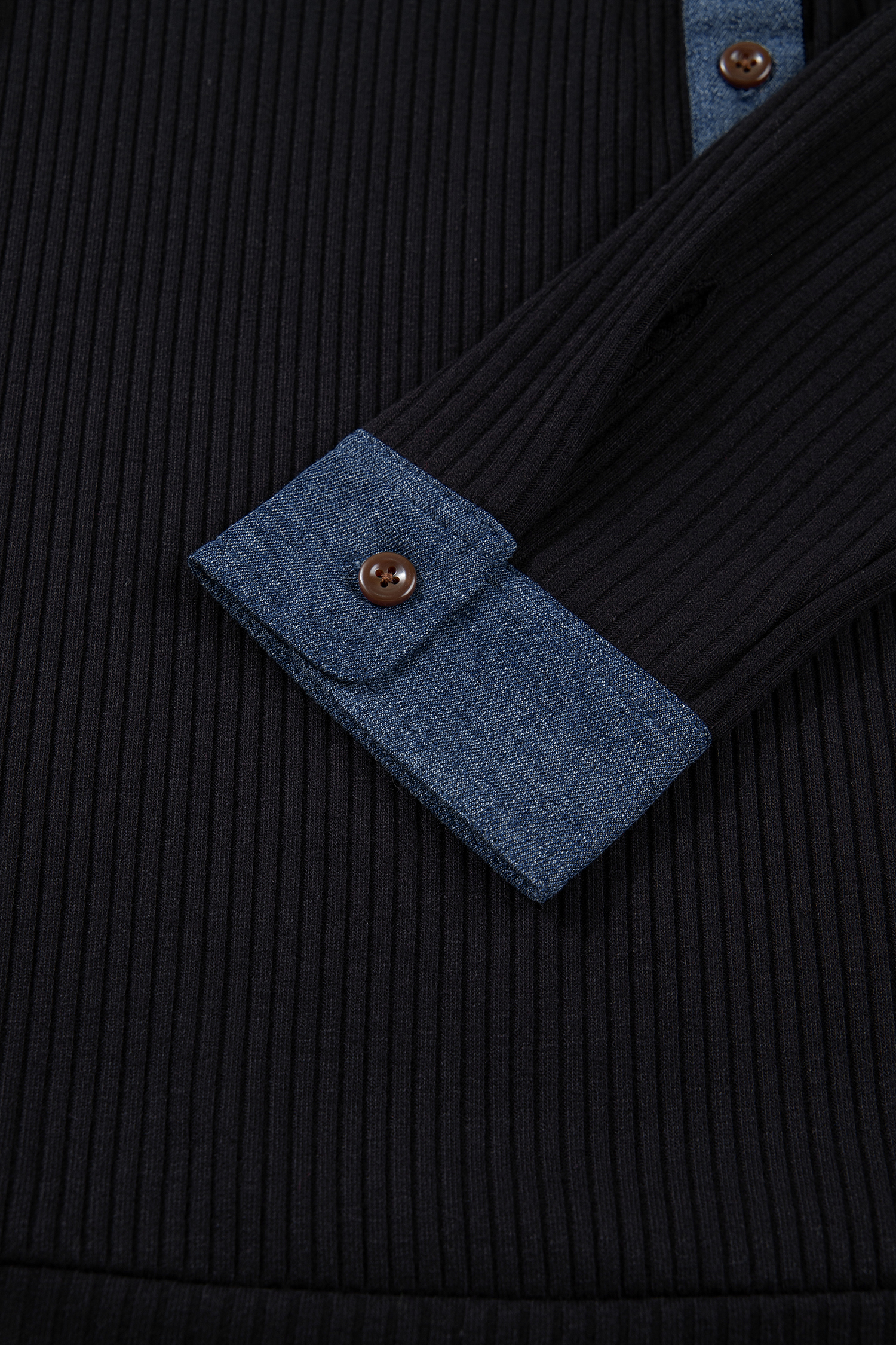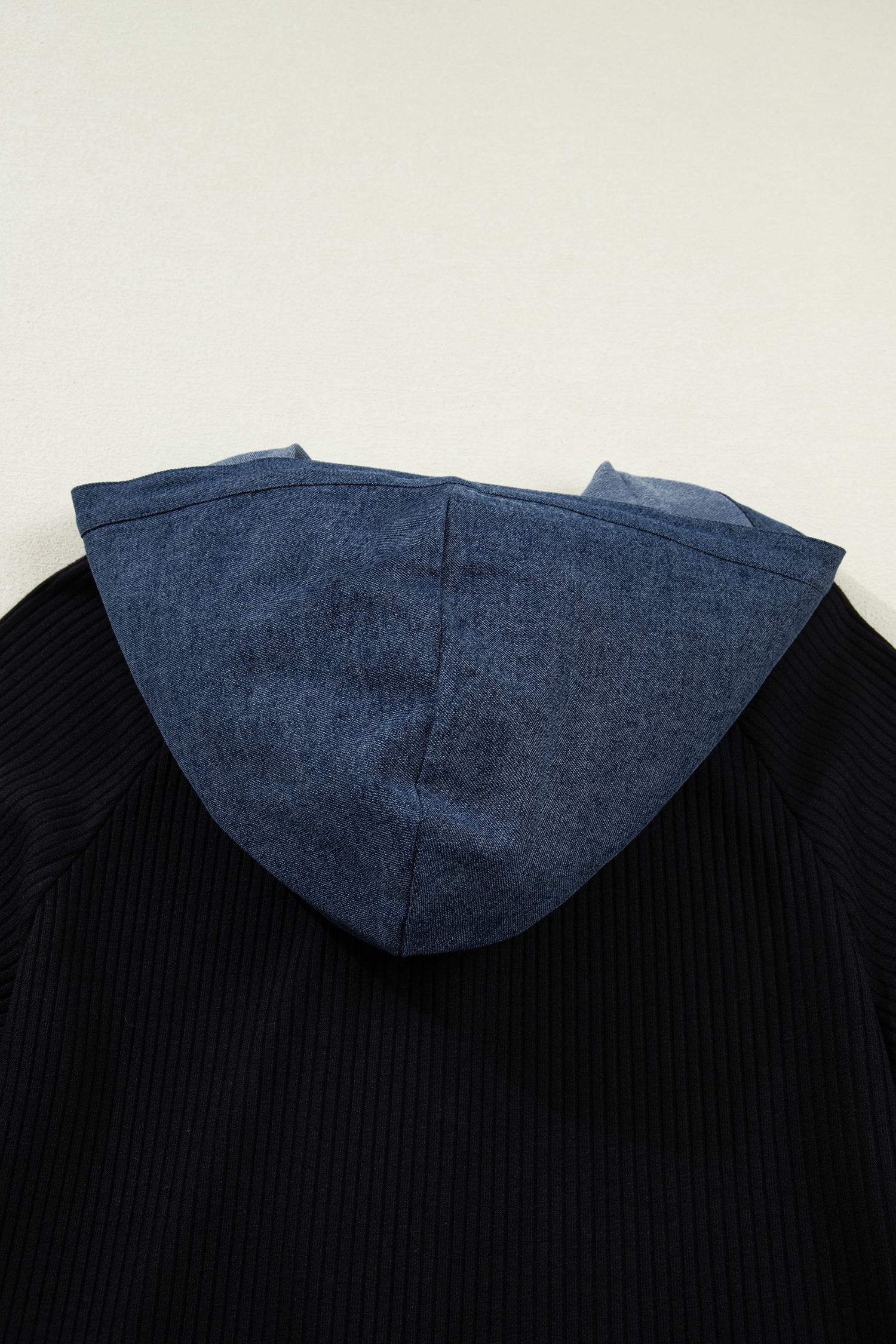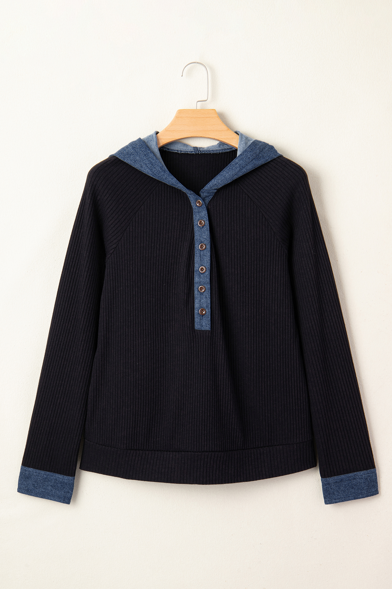 Women’s Black Ribbed Knit Hoodie with Denim Patchwork – Casual Long Sleeve Top for Autumn