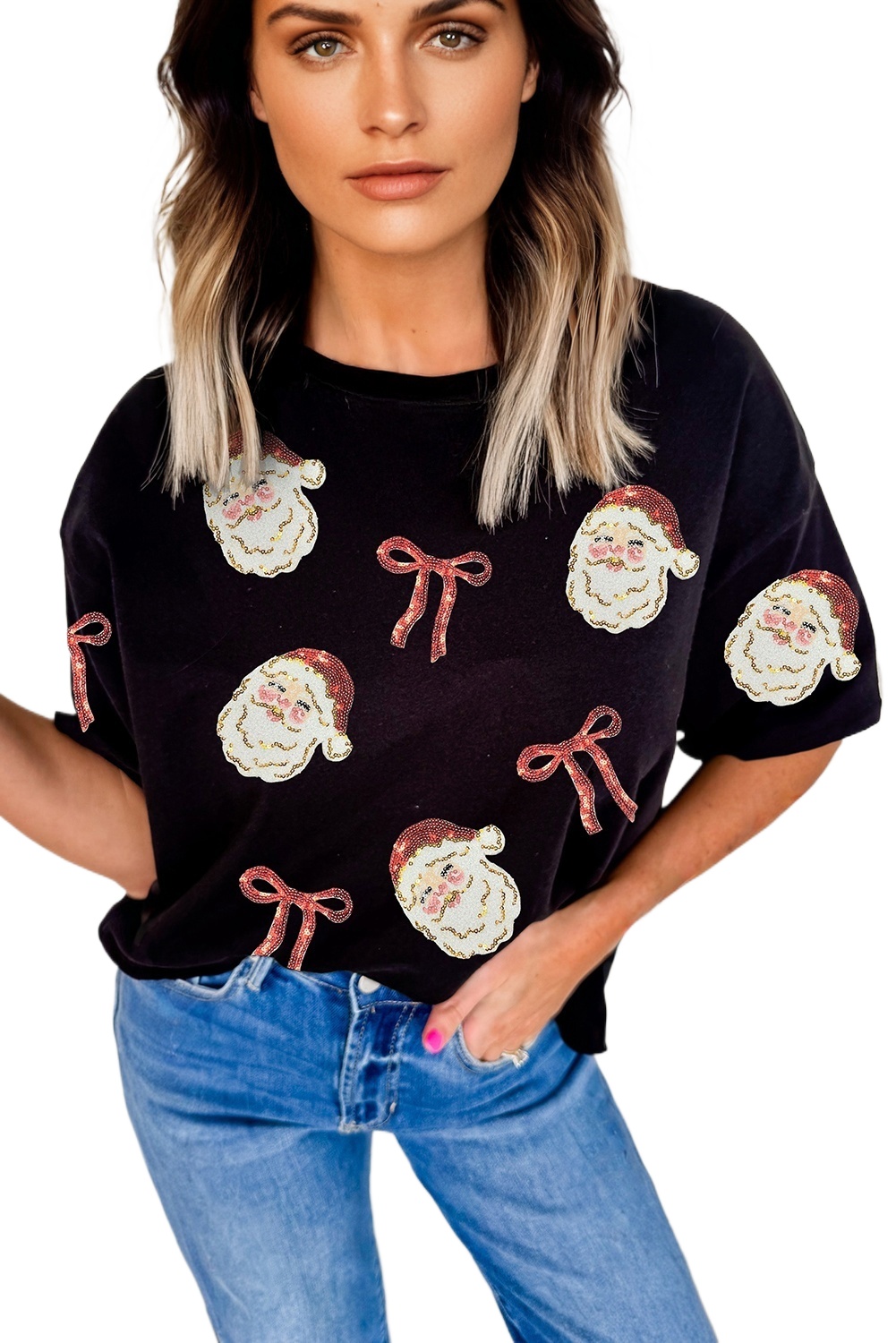 & Free Shipping✓ Sparkling Sequin Santa Claus Bow Patch: Adds a festive shimmer to this black T-shirt, enhancing your holiday outfits with subtle holiday cheer for women.