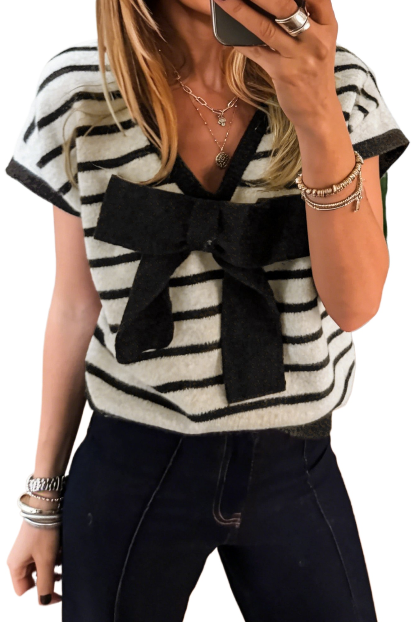 Women's Black Stripe Bow Applique Short Sleeve Sweater – Casual Summer Style for Everyday WearWomen’s Black Stripe Bow Applique Short Sleeve Sweater – Casual Summer Style for Everyday Wear