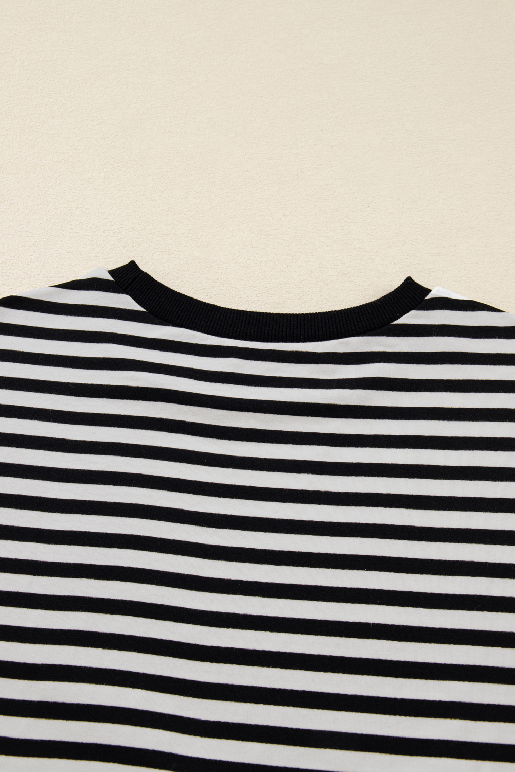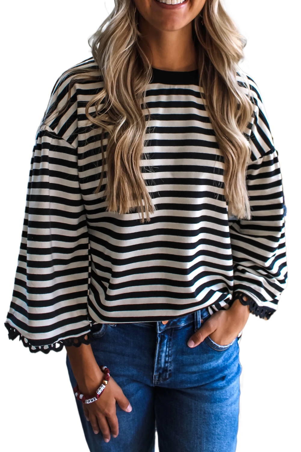 Women’s Black Striped Drop Shoulder Loose Top with Lace Trim Bracelet Sleeves – Casual Daily Wear for Fall Days