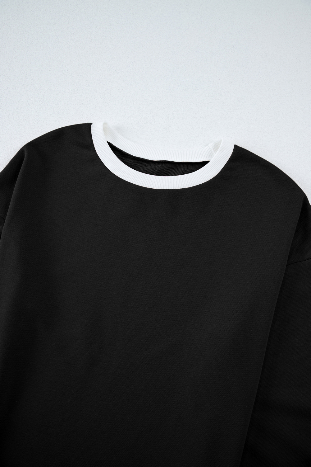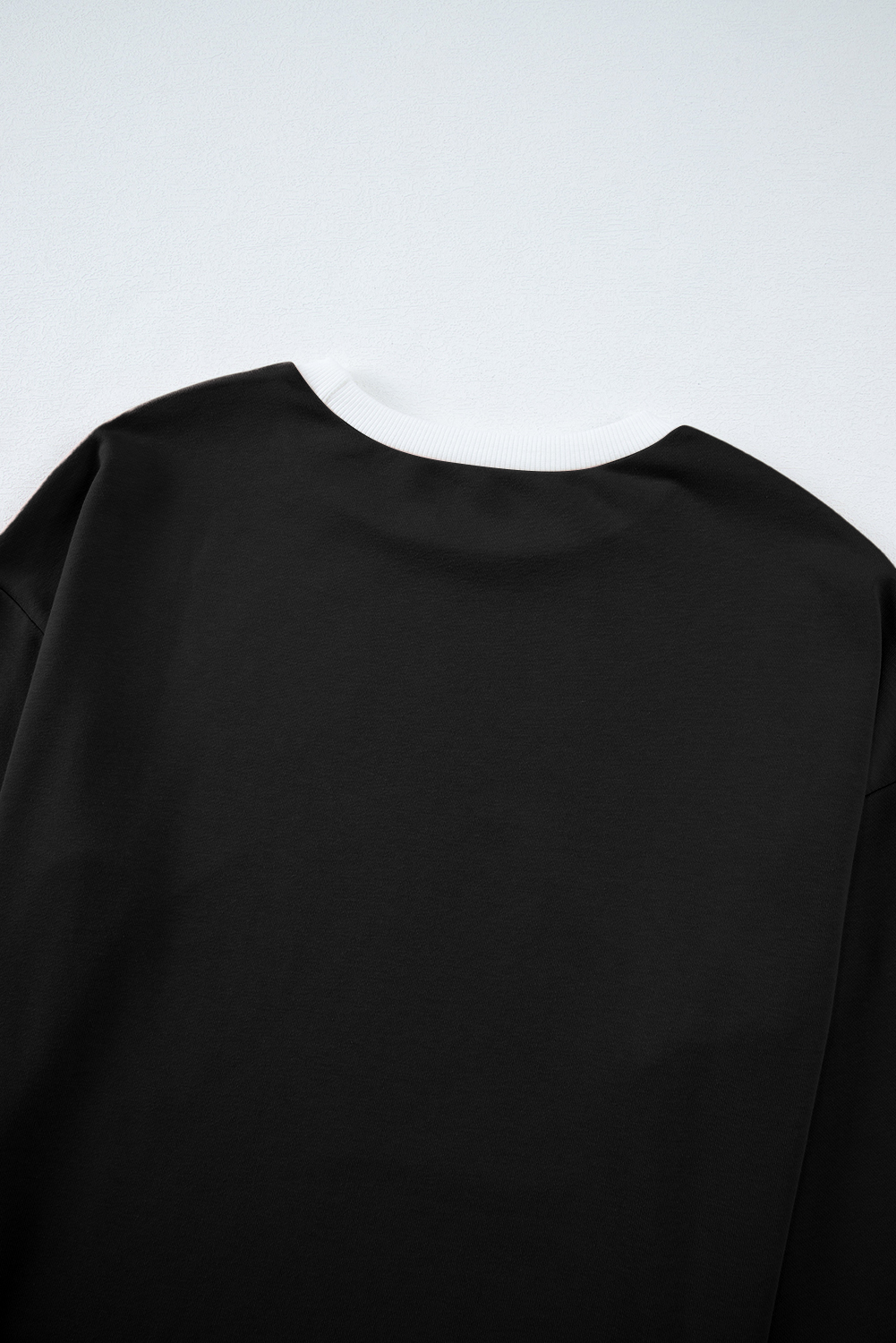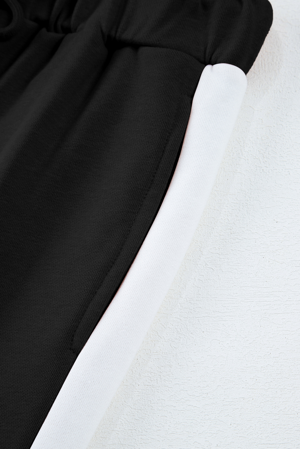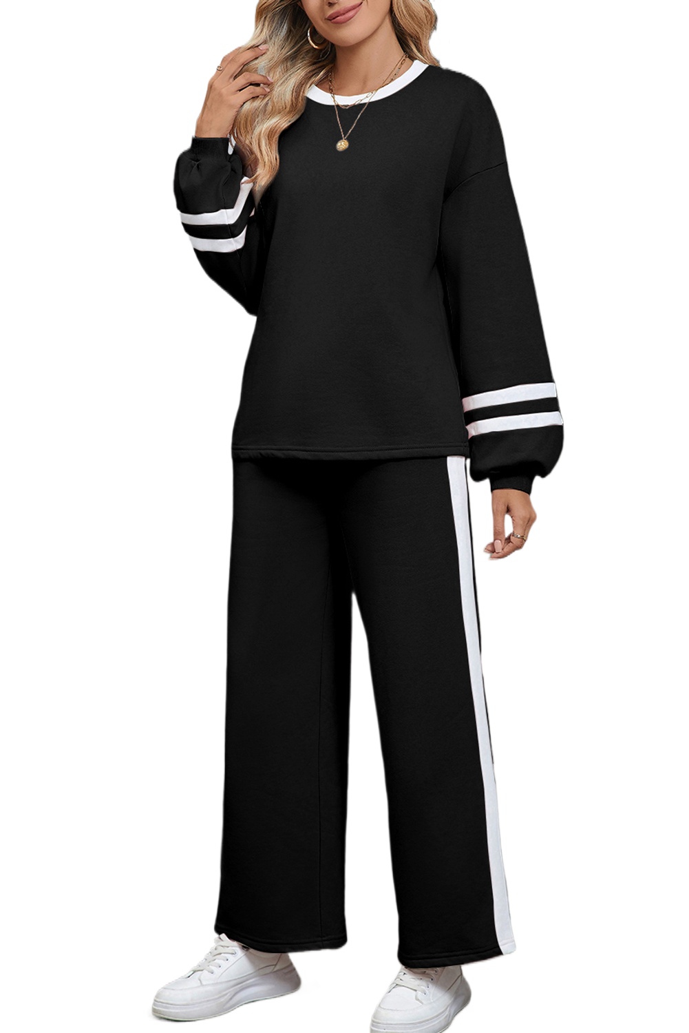 Women’s Black Varsity Stripe Patchwork Puff Sleeve Pullover & Wide Leg Pant Set