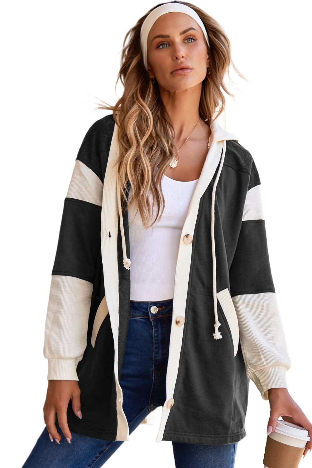 Women’s Black Waffle Knit Oversize Hoodie with Color Block Patchwork – Casual Daily Wear Button Front Style