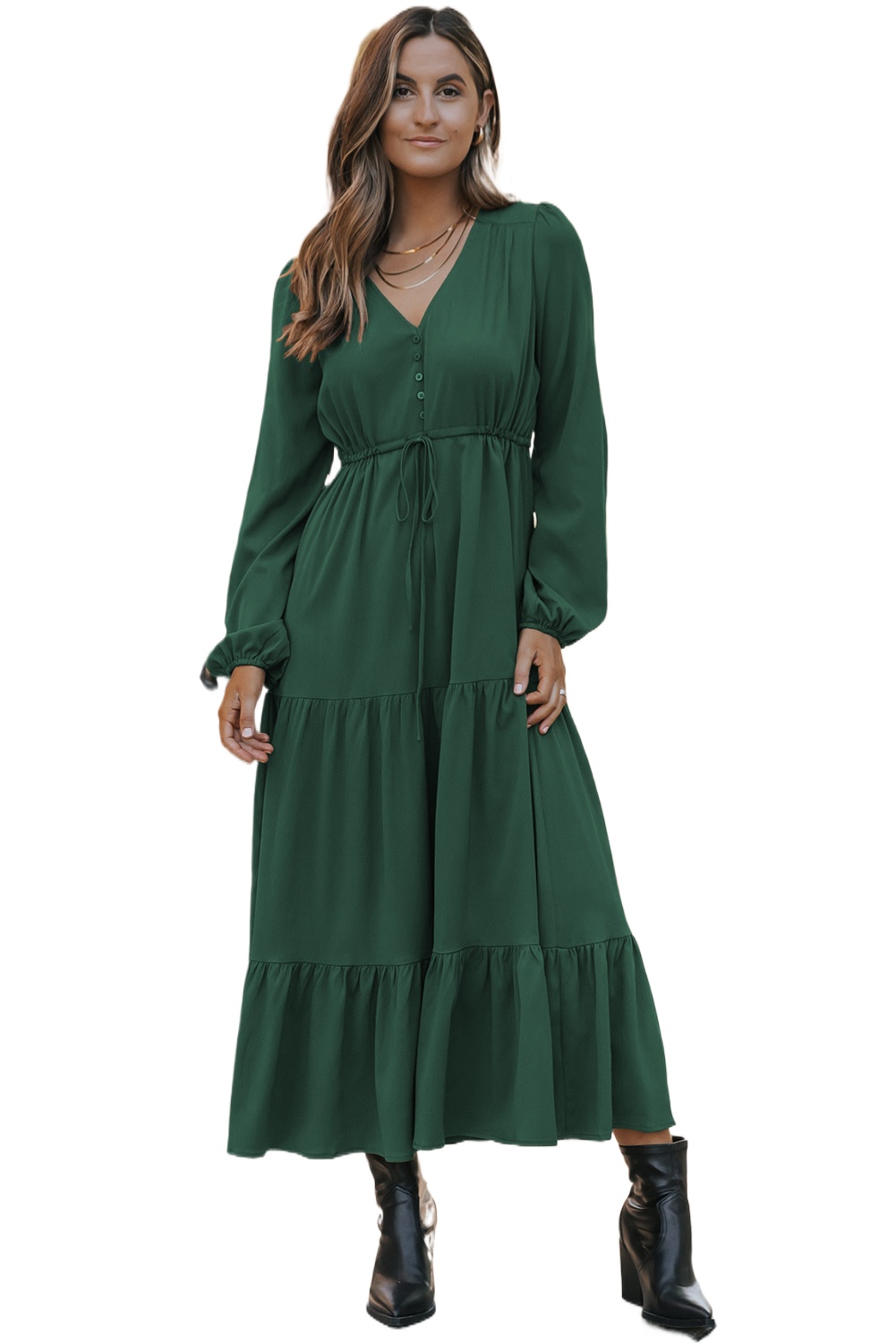 Women’s Blackish Green V-Neck Long Sleeve Maxi Dress for Daily Wear