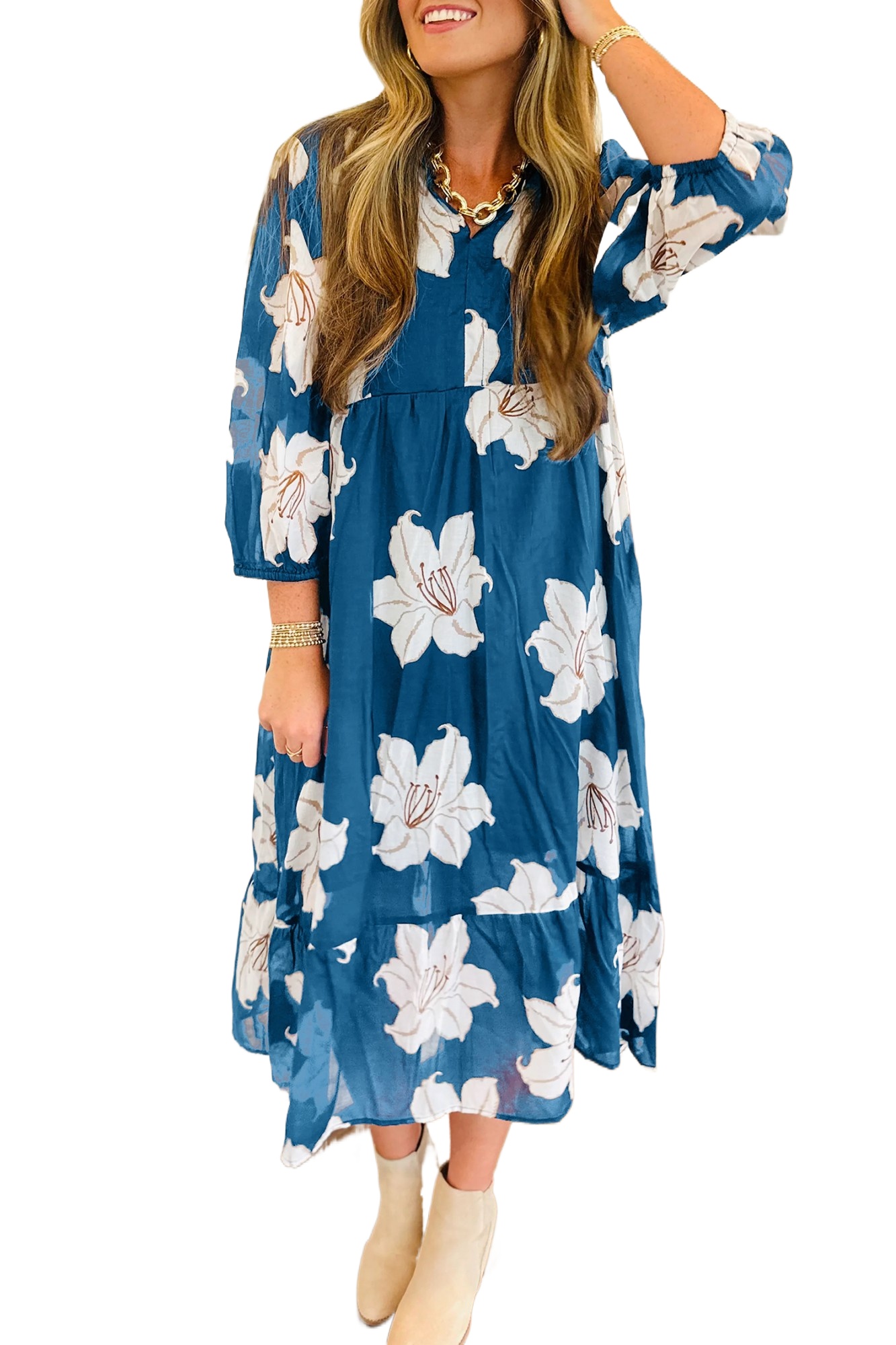 Women’s Blue Floral Print Midi Dress – Casual 3/4 Sleeve V Neck Shift Dress for Spring & Summer