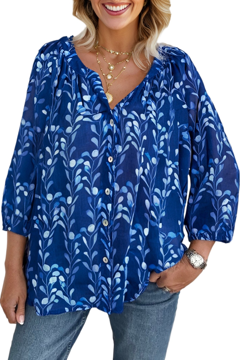 Women’s Blue Floral Print Notched Neck Blouse – Casual Bracelet Sleeve Top for Daily Wear