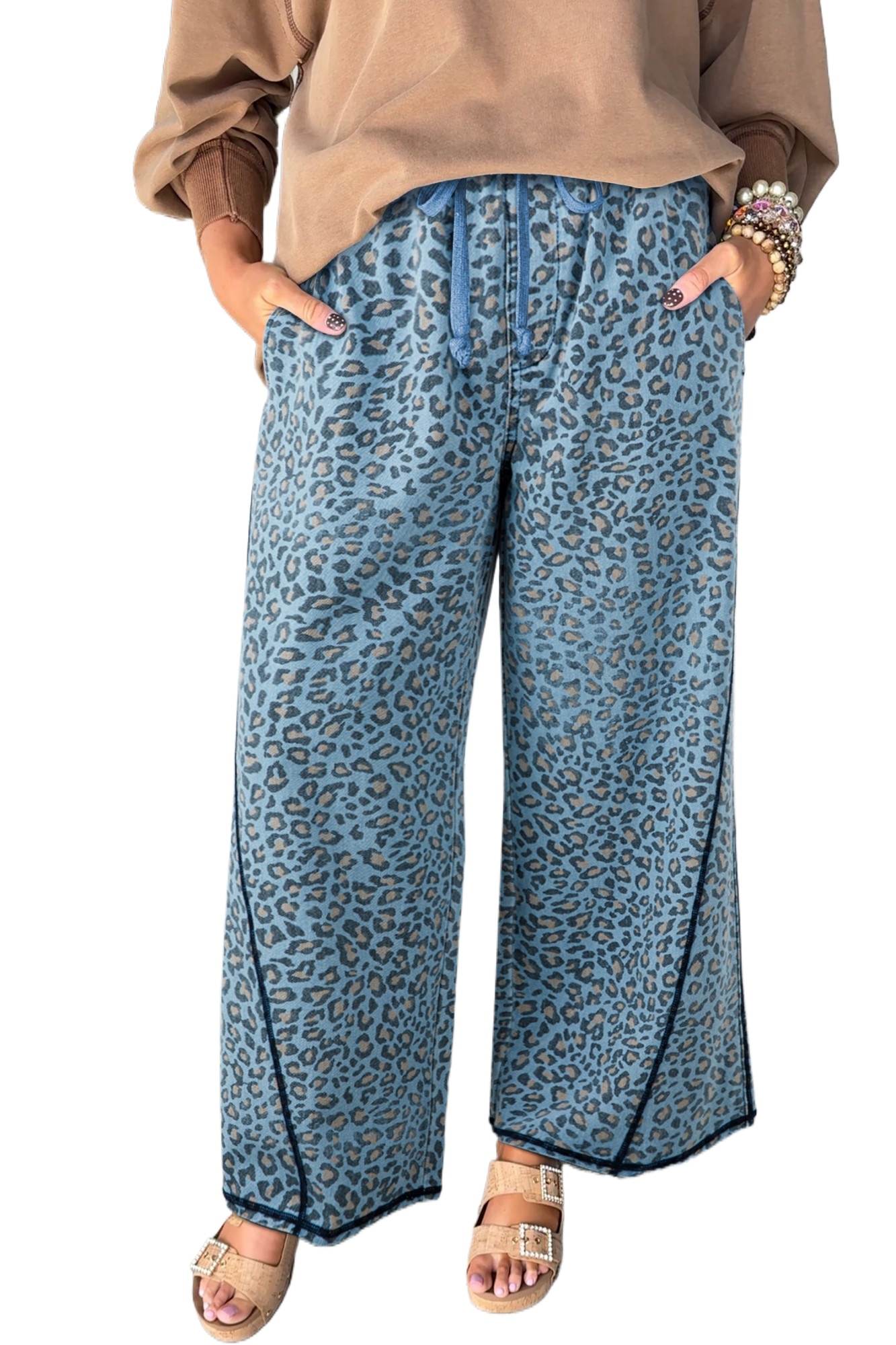 Women’s Blue Leopard Print Wide Leg Drawstring Jeans – Casual Spring Style for Daily Wear