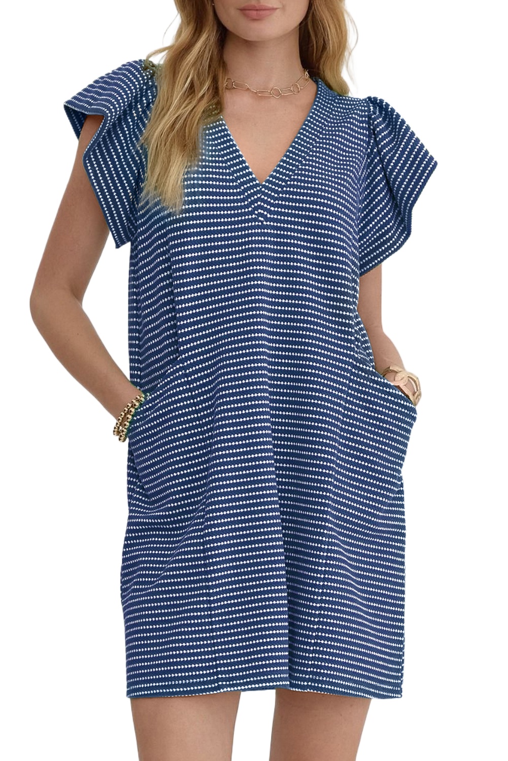 Women’s Blue Stripe Textured Knit Mini Dress – Casual V Neck Flutter Sleeve for Summer Fun