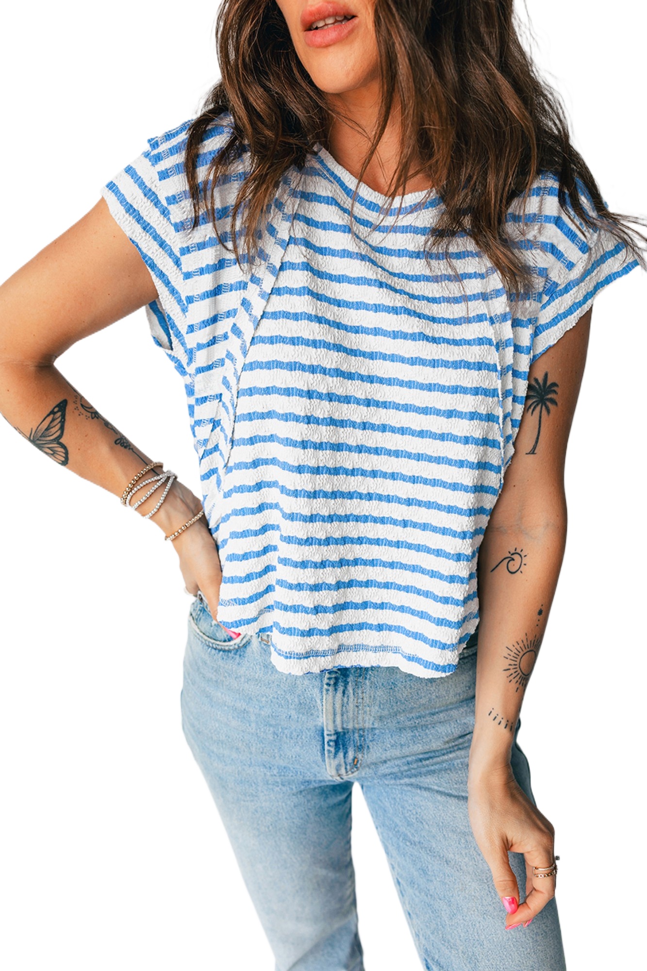 Women’s Blue Stripe Textured Short Sleeve Patchwork T-Shirt – Casual Summer Essential