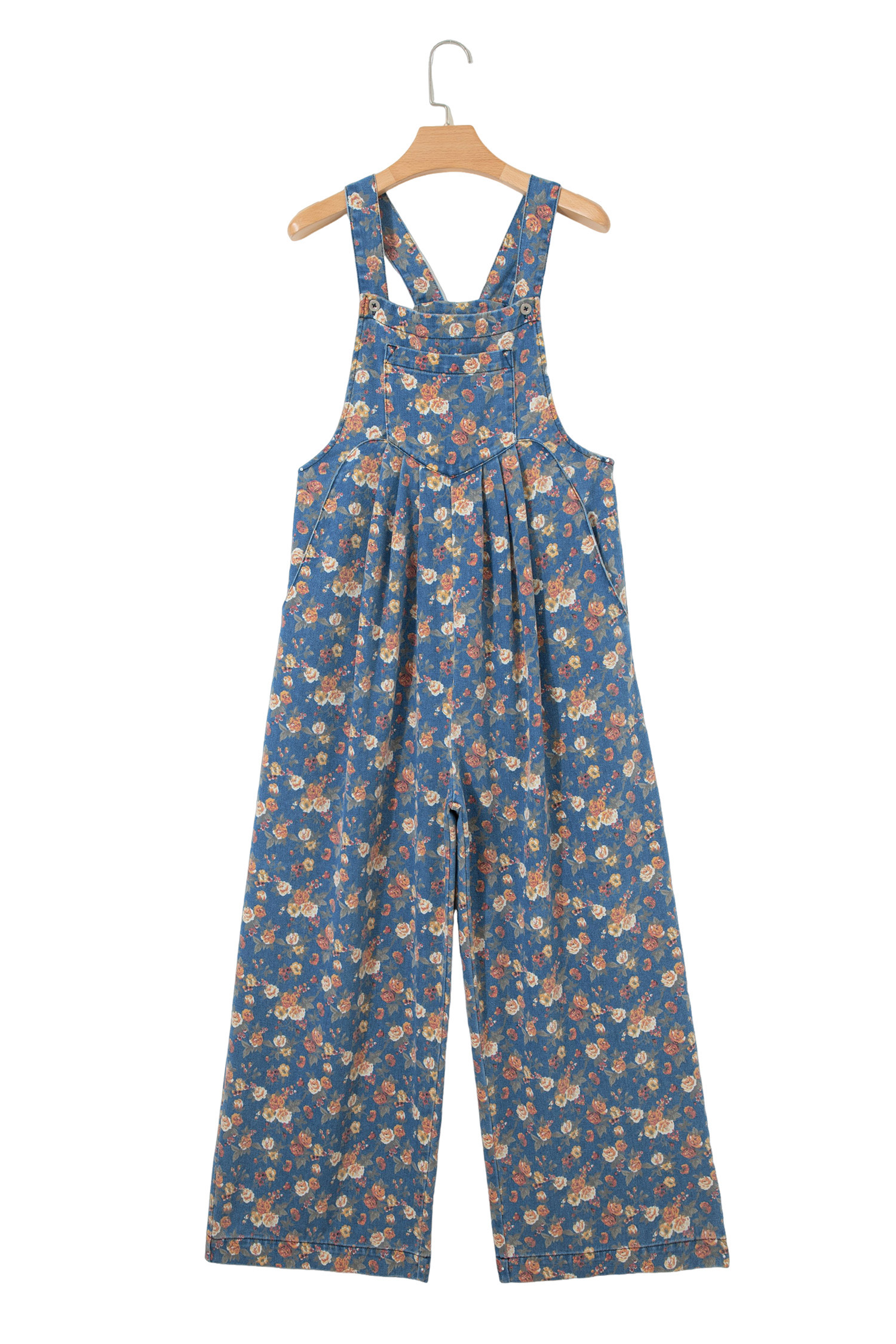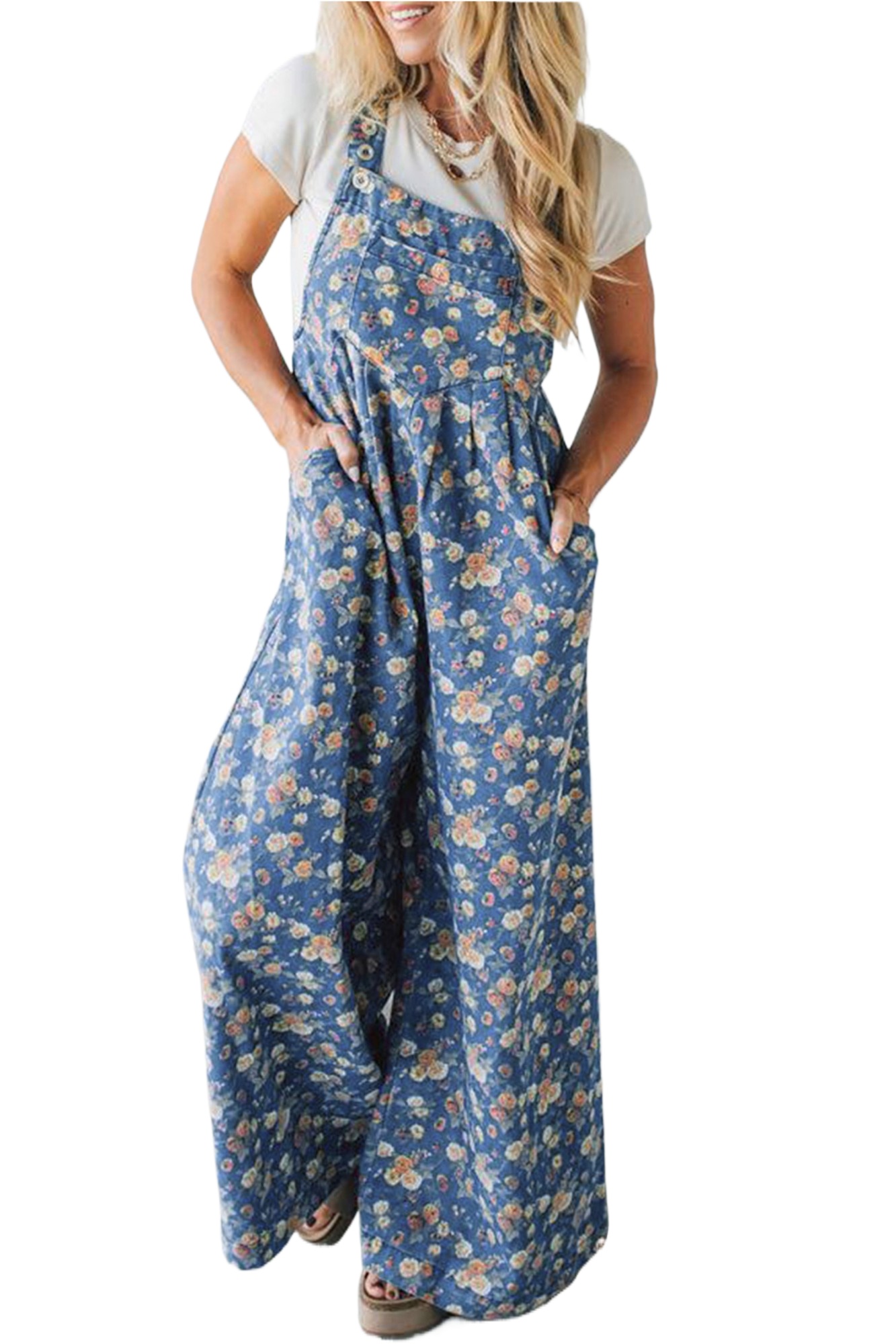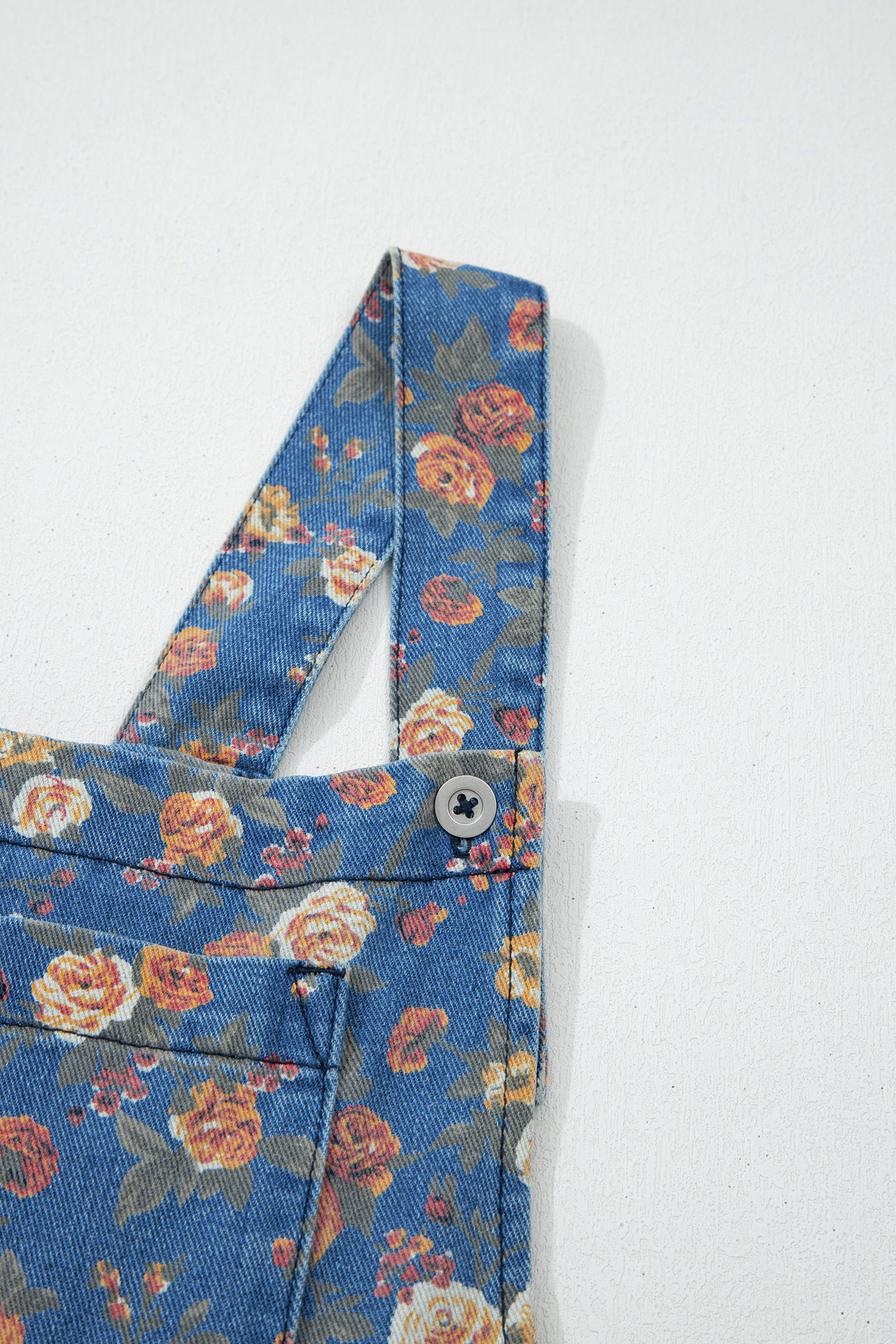 Women's Blue Vintage Rose Printed Denim Overall Jumpsuit – Casual Summer Style for Daily AdventuresWomen’s Blue Vintage Rose Printed Denim Overall Jumpsuit – Casual Summer Style for Daily Adventures