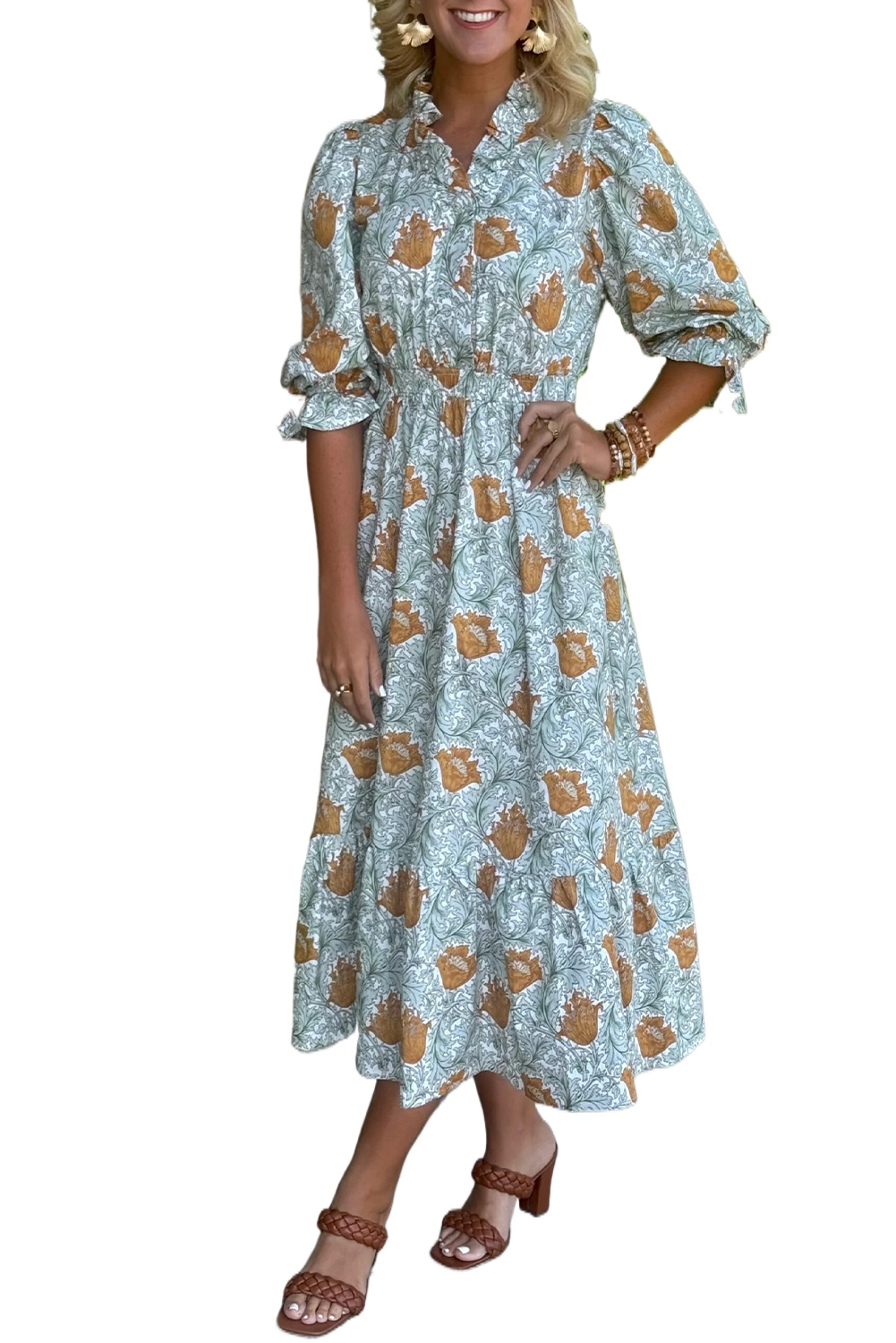 Women’s Brown Floral Printed Long Dress – Bohemian V Neck Style for Daily Wear